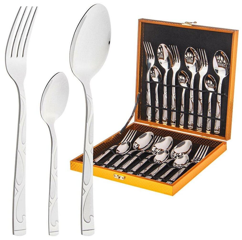 Набор состоиз из 18 предметов - 6 столовых ложек, 6 столовых вилок, 6 чайных ложек. Набор идет в подарочном деревянном кейсе, который также подойдет для дальнейшего хранения столовый приборов.