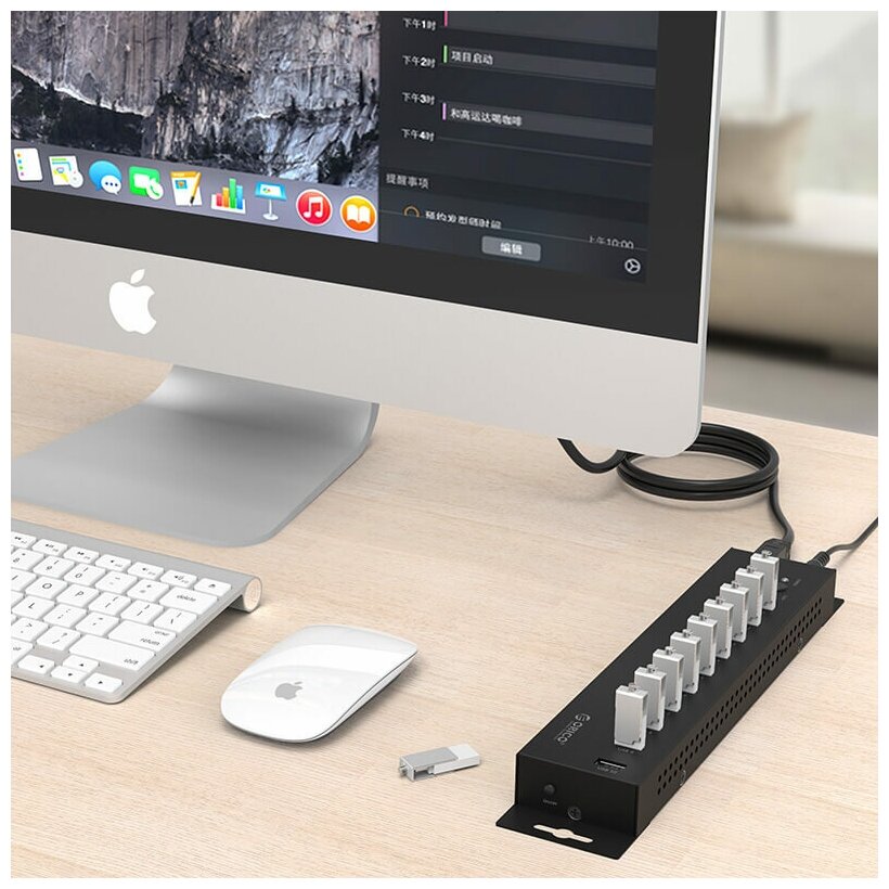 Концентратор ORICO -BK позиционируется как промышленный благодаря комплекту из 10 портов стандарта USB2.0. В качестве источника питания выступает адаптер 12В 5А. Корпус концентратора изготовлен из металла с напылением. Боковые грани устройства выполнены решетчатыми для отвода тепла. Устройство оснащено защитой от скачков напряжения. Для начала работы не требуется установка дополнительных драйверов, в работе совместим со всеми операционными системами