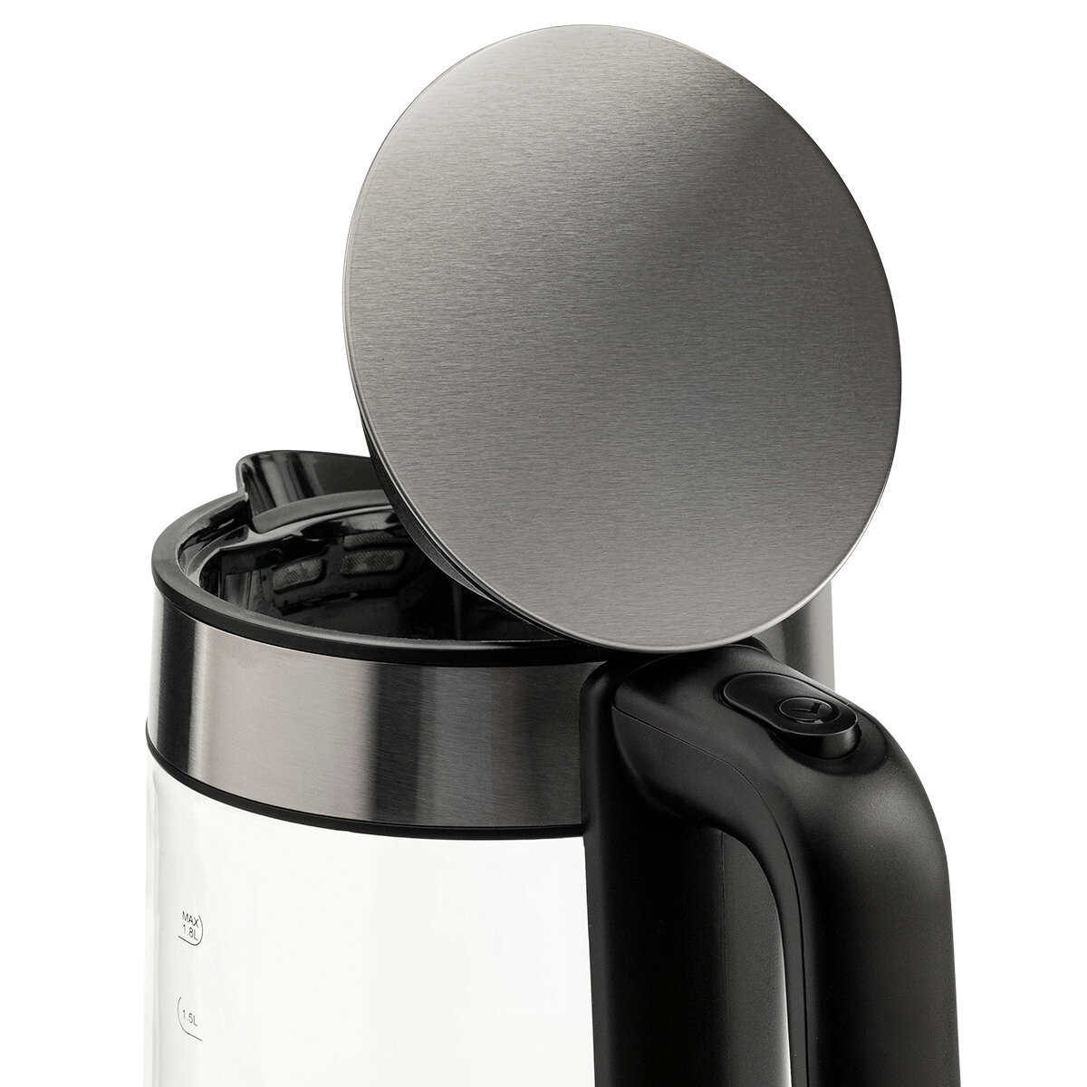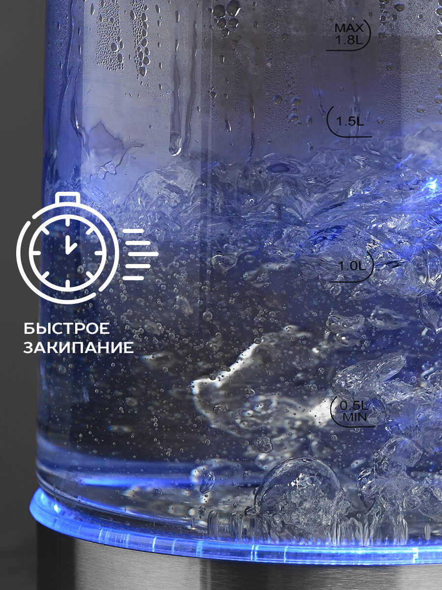 Хороший чайник, работает как лошадка, воду раз по 10 за день кипятит. Колба стеклянная, на ручке кнопка для открывания крышки, подсветка синяя. Хоть и объем большой, но греет очень быстро. Крышка, носик, нагревательный элемент сделаны из нержавейки, т.е. нет пластиковых деталей, контактирующих с водой.