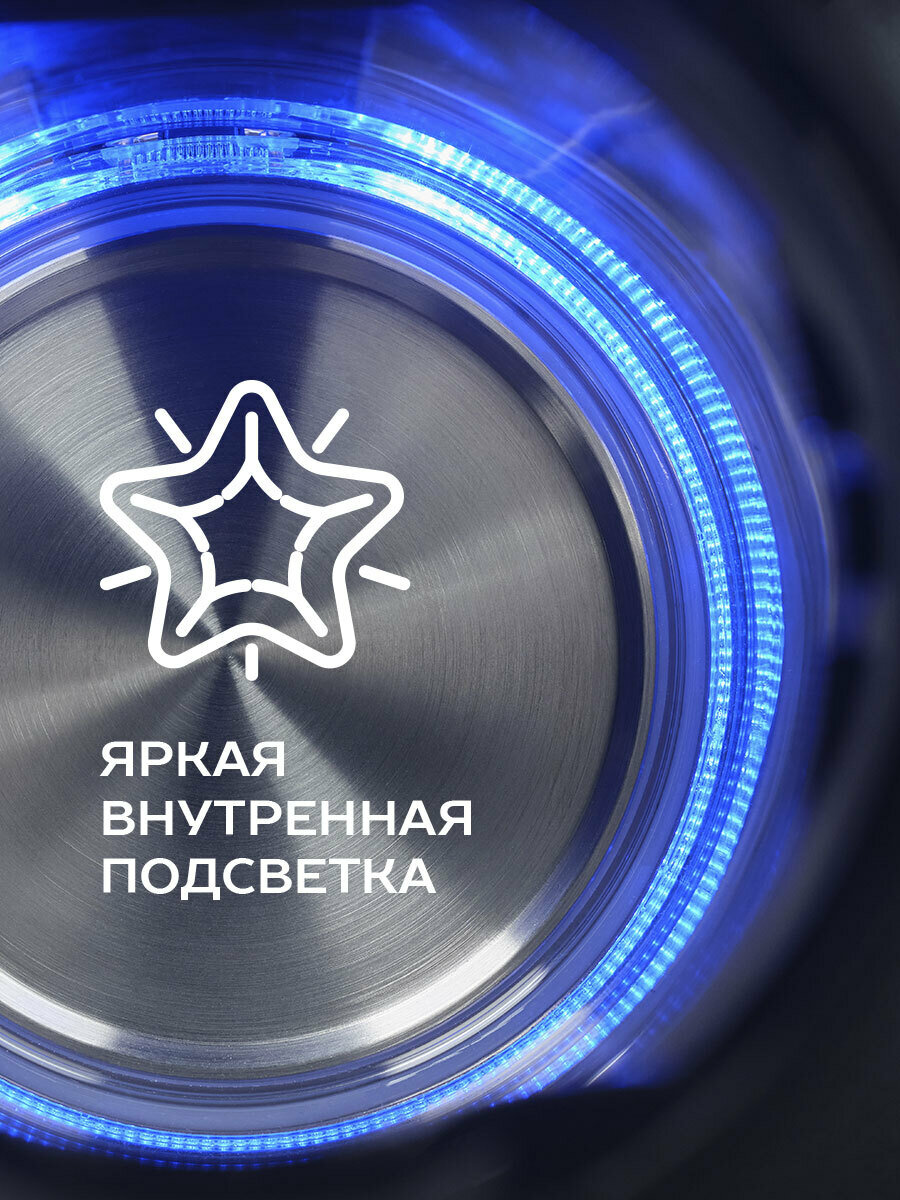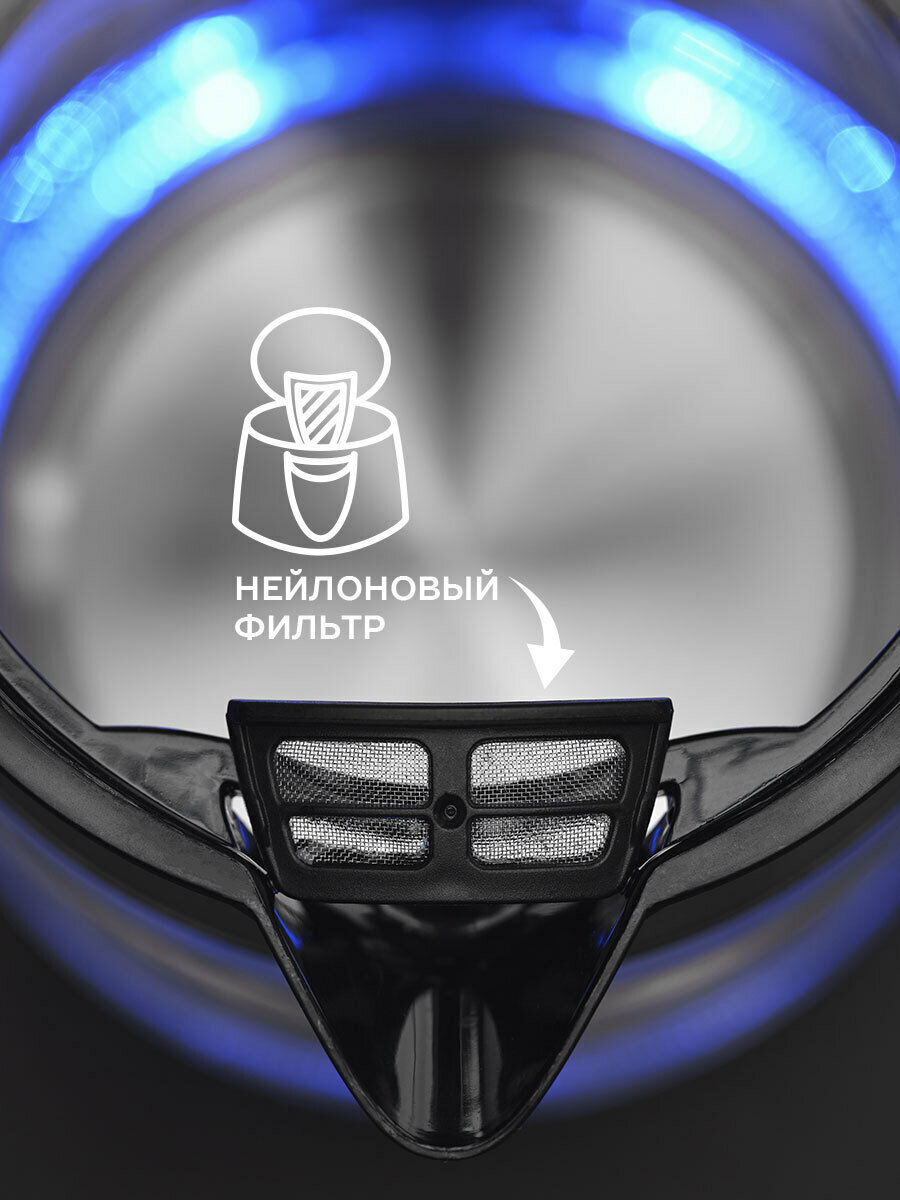 | Особенности | Подсветка, Отсек для шнура, Поворотное основание на 360 °С, Открывание крышки кнопкой, фильтр от накипи |