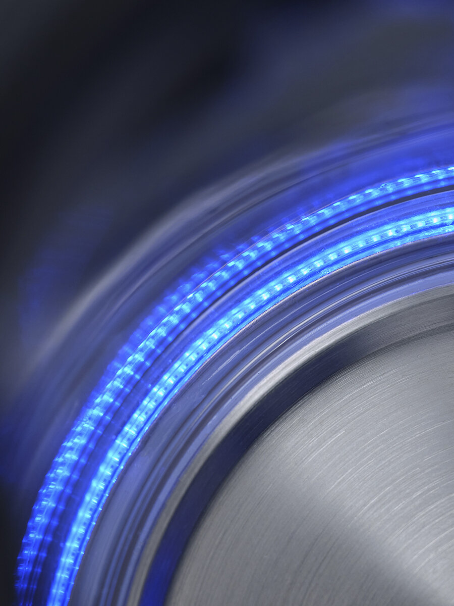 Современный дизайн, сталь +стекло. То есть всё сделано в парадигме безопасности и надёжности, стекло нейтрально, сталь долговечна. Тэн скрытый, в воде нет никаких отложений, но все равно на носике есть фильтрационная сетка. Снизу покругу подсветка, в вечернее время она вполне уместна и смотрится это красиво.