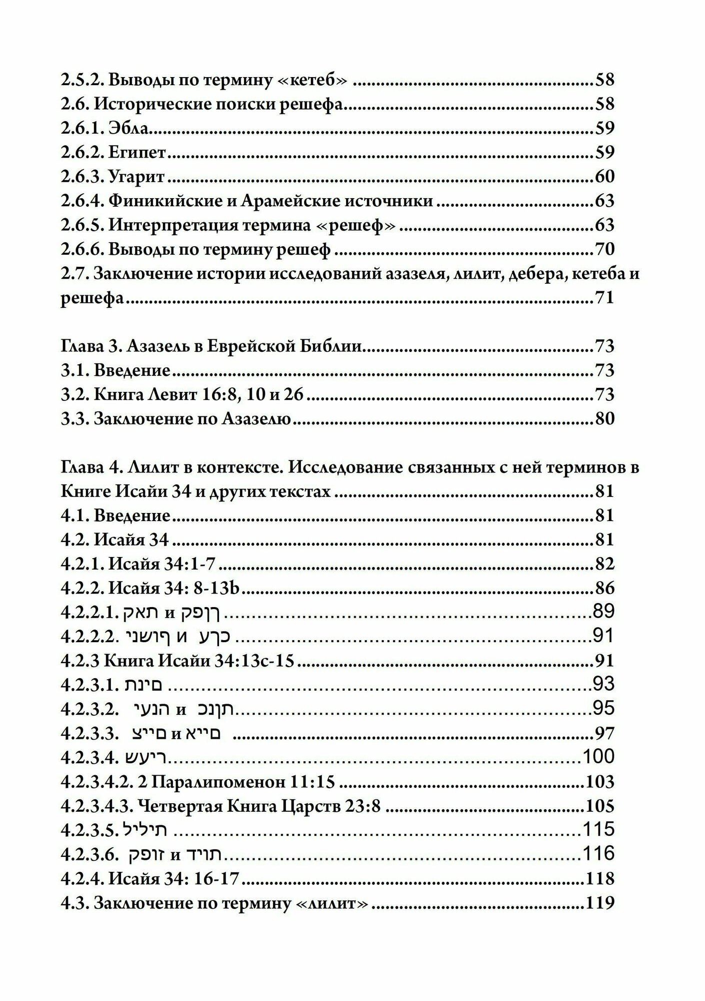 В настоящей книге представлено полноценное исследование материалов Ветхого Завета Еврейской Библии, касающееся пяти спорных имен демонов, каковыми их считает современная зарубежная библеистика и оккультисты: Азазеля, Лилит, Решефа, Кетеба и Дебера. И если в отношении первых двух в различных направлениях философских наук и магии существует достаточное количество трудов, а Решеф знаком практически только ученым, занимающимся религией Древнего Востока, то в отношении Кетеба и Дебера сведения фактически отсутствуют, в частности у российского магического сегмента. Это связано с тем, что имена демонов, или персонифицированных сил зла, как указано у автора, написаны исключительно на иврите, канонические и неканонические версии Библии, включая Библию короля Якова, Септуагинту, Вульгату и др., опускают имена, переводя их просто как силы природы/чума/мор/ стрелы зла и т. д. Автор проделала гигантскую работу не только по подборке и анализу всех текстов Еврейской Библии, но и привела (в ссылках) труды и работы всех ученых библеистов, в разное время занимавшихся вопросами демонологии Ветхого Завета.