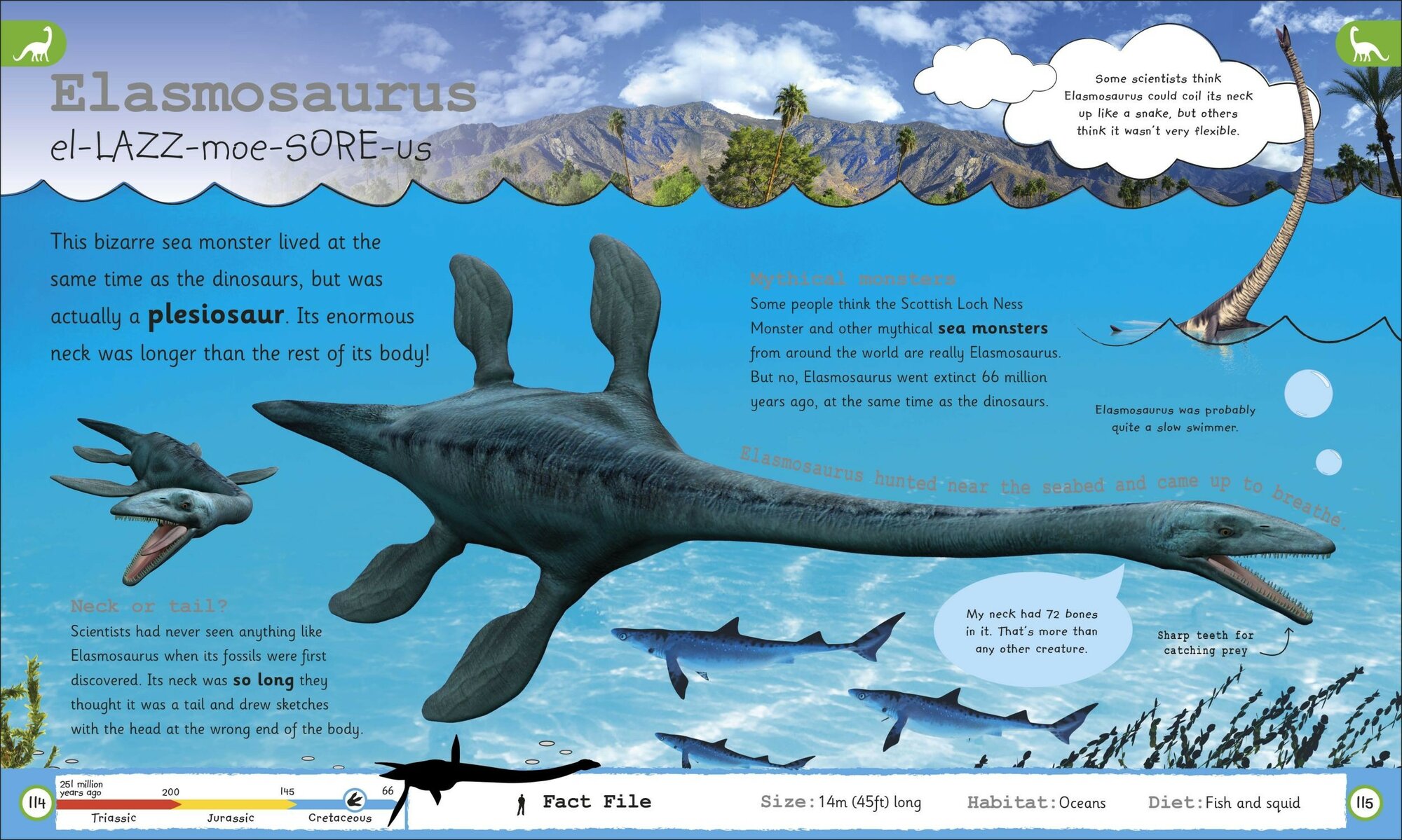 Первая наша энциклопедия о динозаврах от DK, реалистичные изображения на каждом развороте, дана информация по огромному количеству разных видов динозавров, упор сделан на иллюстрации, текста немного, написано доступным языком. В начале книги дана информация об эрах, потом о динозаврах и окаменелостях. В три года сына не слишком заинтересовала, читаем немного ее, думаю лет с четырёх до семи будет интересно, или раньше, но большим фанатам динозавров.