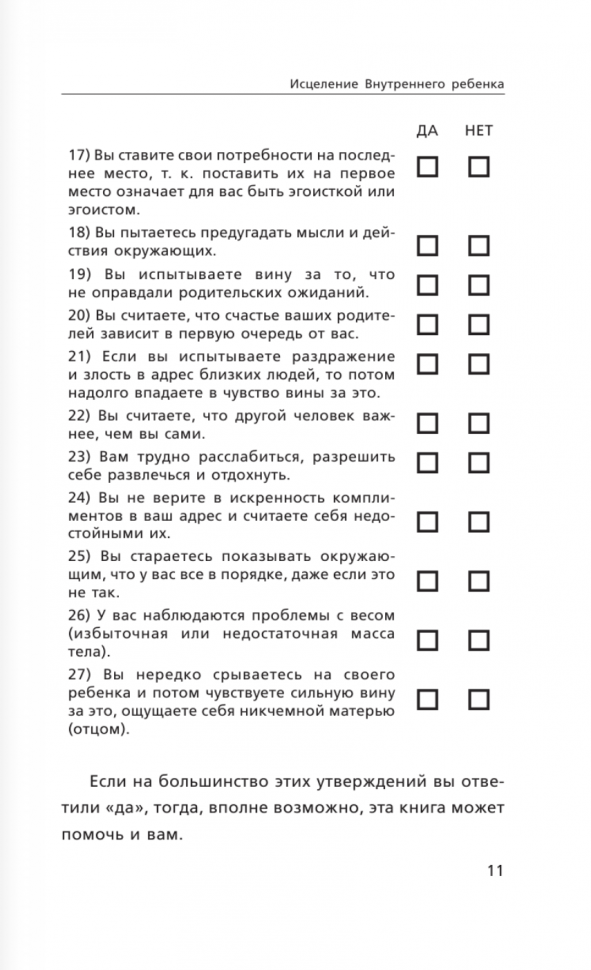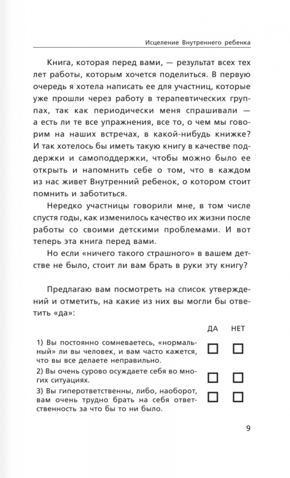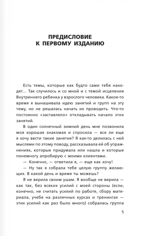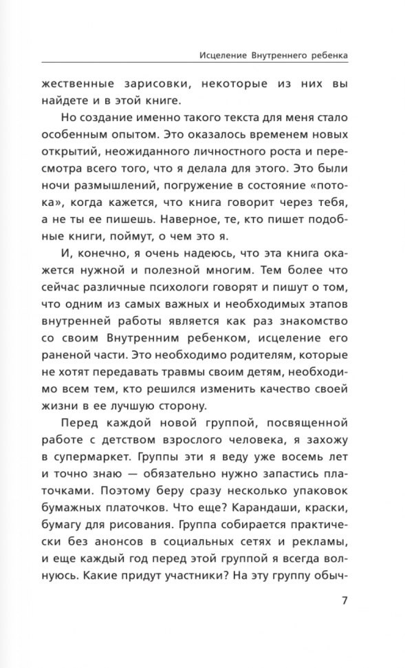 Книга написана для участниц тренинга, который проводит автор. В то же время с книгой можно работать и самостоятельно. Не все страницы книги занимает текст. Автор оставляет место чтобы можно было выполнять задания непосредственно в ней. Я выполняла не все: рисовать мне не захотелось. Полезнее всего на мой взгляд упражнения с Внутренним Критиком. Вообще книга о субличностях. И суть работы - вырастить а себе Взрослого и Достаточно Хорошего Внутреннего Родителя, способных позаботиться о Раненом Внутреннем Ребёнке