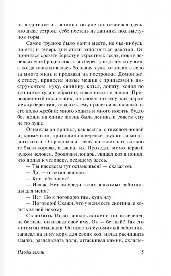 У Гамсуна я читал "Голод". "Плоды земли" очень сильно отличаются от этого романа. В данном произведении идет повествование о простых людях, которые трудятся на земле. Автор реалистично показывает их быт, их заботы, их желания и пороки. Гамсун буквально забирается в души людей. Авторский слог отличается от того, что был в "Голоде". Тут он проще, более "прямой", без замысловатых оборотов.