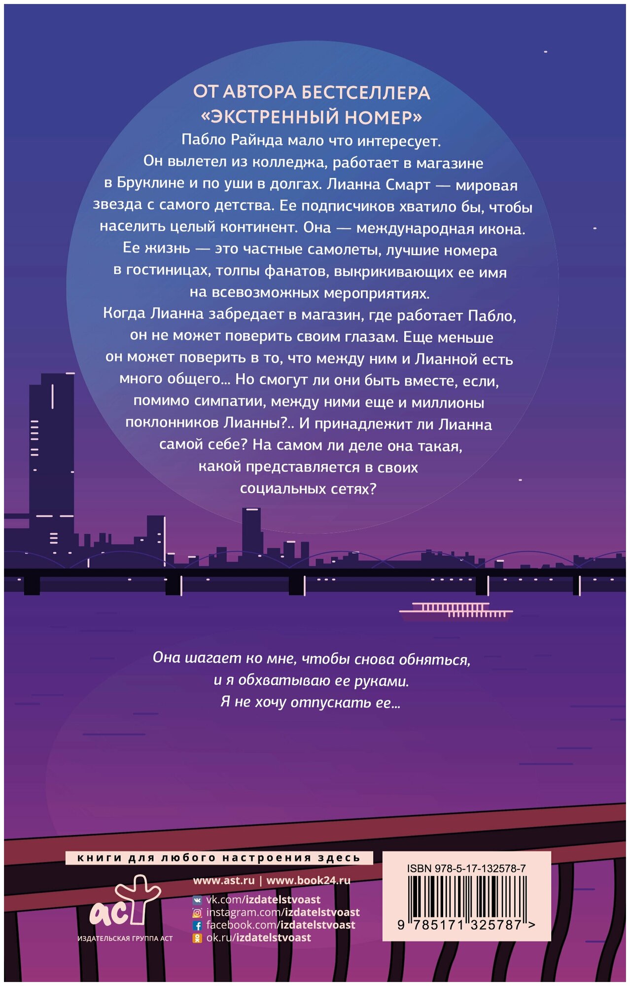 Пабло Райнда мало что интересует. Он вылетел из колледжа, работает в магазине в Бруклине и по уши в долгах. Лианна Смарт — мировая звезда с самого детства. Ее подписчиков хватило бы, чтобы аселить целый континент. Она — международная икона. Ее жизнь — это частные самолеты, лучшие номера в гостиницах, толпы фанатов, выкрикивающих ее имя на всевозможных мероприятиях. Когда Лианна забредает в магазин, где работает Пабло, он не может поверить своим глазам. Еще меньше он может поверить в то, что между ним и Лианной есть много общего… Но смогут ли они быть вместе, если, помимо симпатии, между ними еще и миллионы поклонников Лианны?.. И принадлежит ли Лианна самой себе? На самом ли деле она такая, какой представляется в своих социальных сетях?