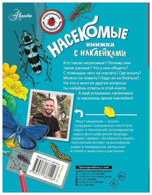 Замечательная книга! Искала что-то развивающие для своего ребенка, который любит насекомых. Наткнулась на эту книгу из серии Маленький исследователь. Прекрасно оформлена, есть в ней интересные вещи, например, можно послушать разных насекомых и получить их наклейки. Ребенок быстро ею увлекся
