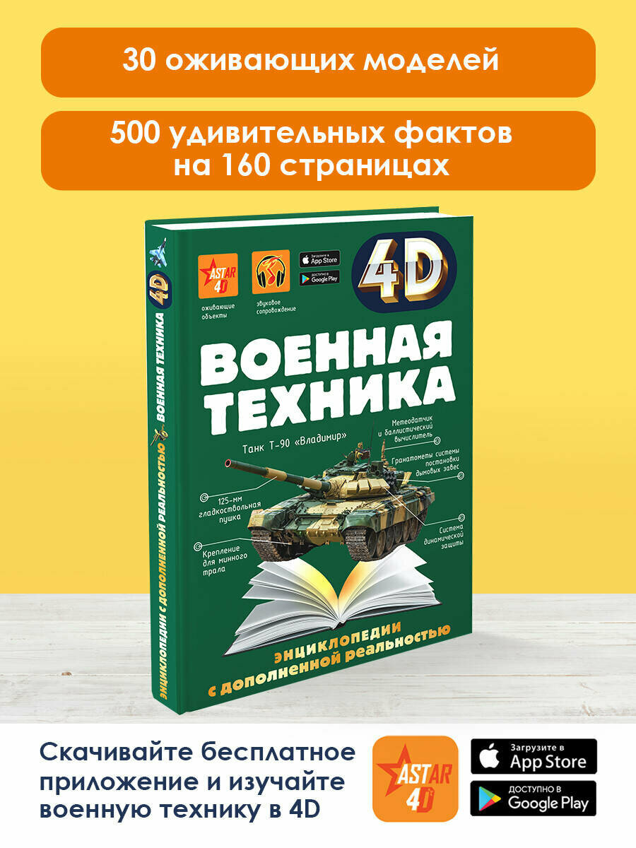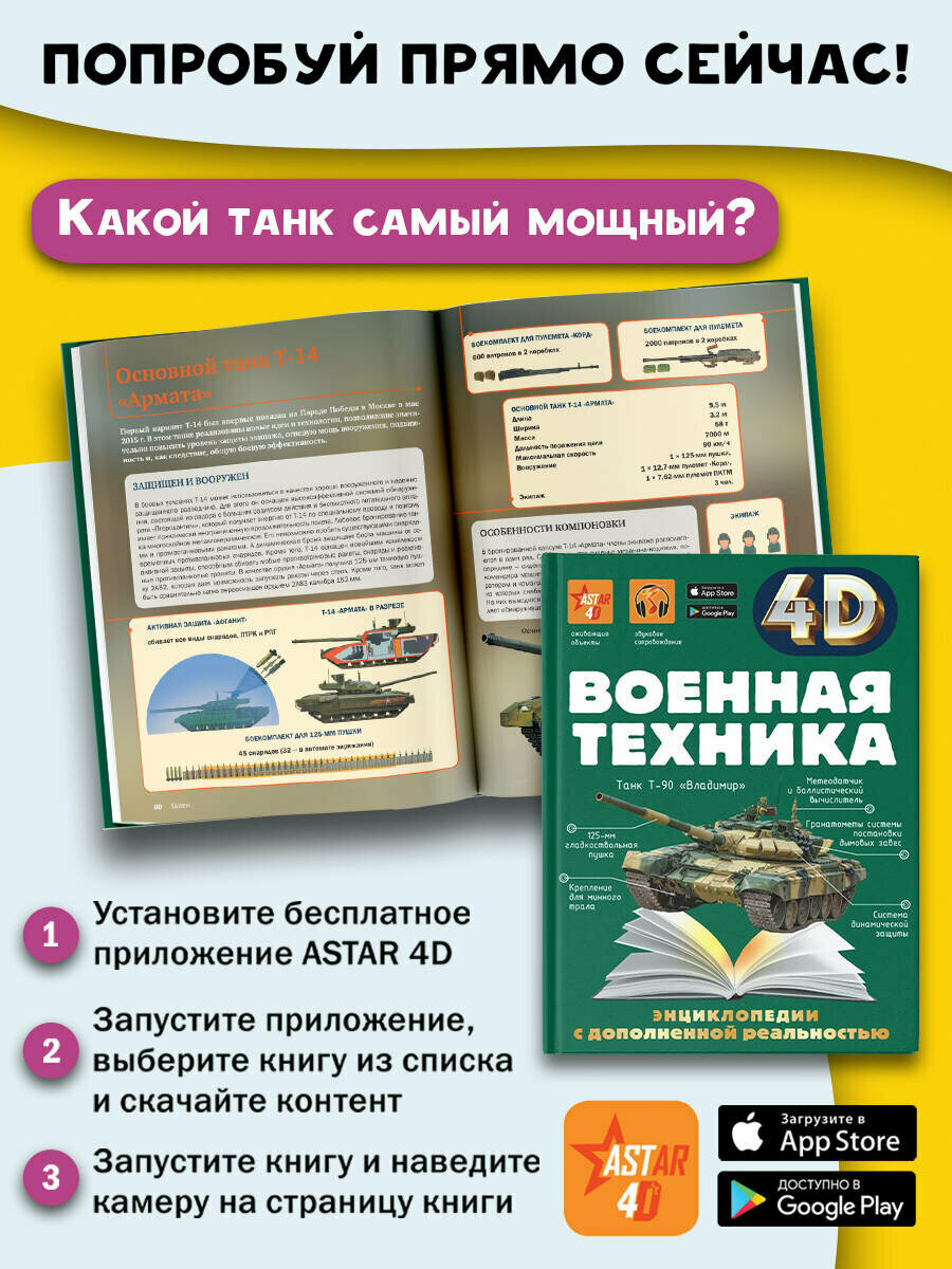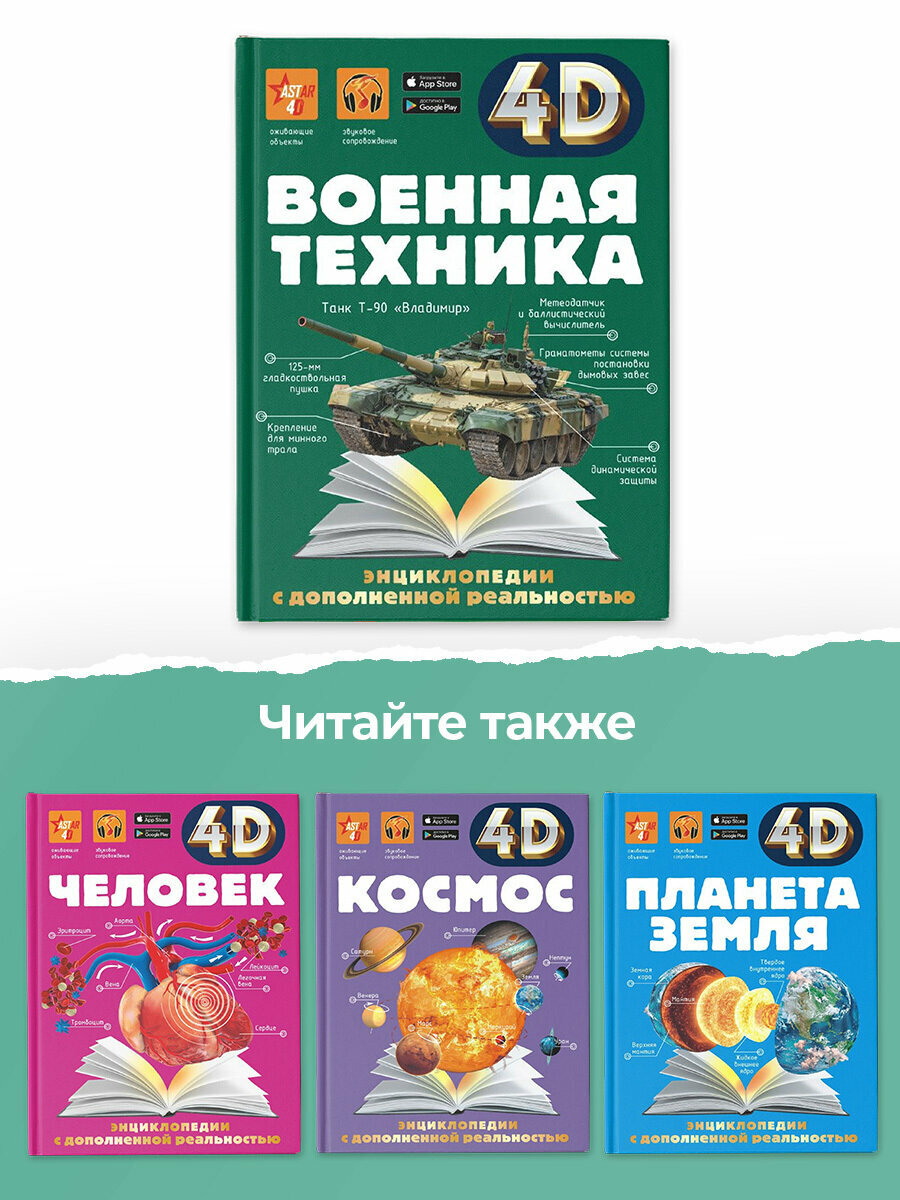 Эта 4D-энциклопедия с дополненной реальностью расскажет о самых разнообразных видах военной техники: артиллерийских системах, танках, самолетах и кораблях, без которых не обходится ни одна современная армия мира. История создания, характеристики и принцип работы боевых устройств и машин раскрываются на страницах этой книги. А 4D-анимации помогут наглядно и в объеме изучить конструкцию пушек, реактивных систем залпового огня и самоходных артиллерийских установок, легких, средних и тяжелых танков, бомбардировщиков, истребителей и штурмовиков, линкоров, крейсеров и авианосцев. Каждая "живая" картинка сопровождается звукозаписью с полезной и интересной информацией. Откройте эту необычную энциклопедию и окунитесь в мир военных изобретений.