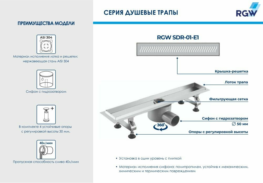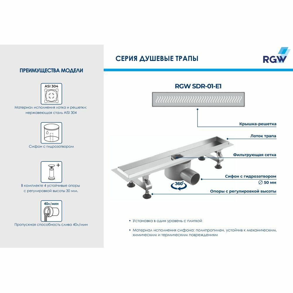 Душевой лоток RGW 80 21210180-01. Цвет решетки: хром, Материал: нержавеющая сталь, Диаметр слива: 5 см, Пропускная способность слива: 40 л/мин. В комплекте поставки: Душевой трап: сифон, решетка, Регулируемые ножки.