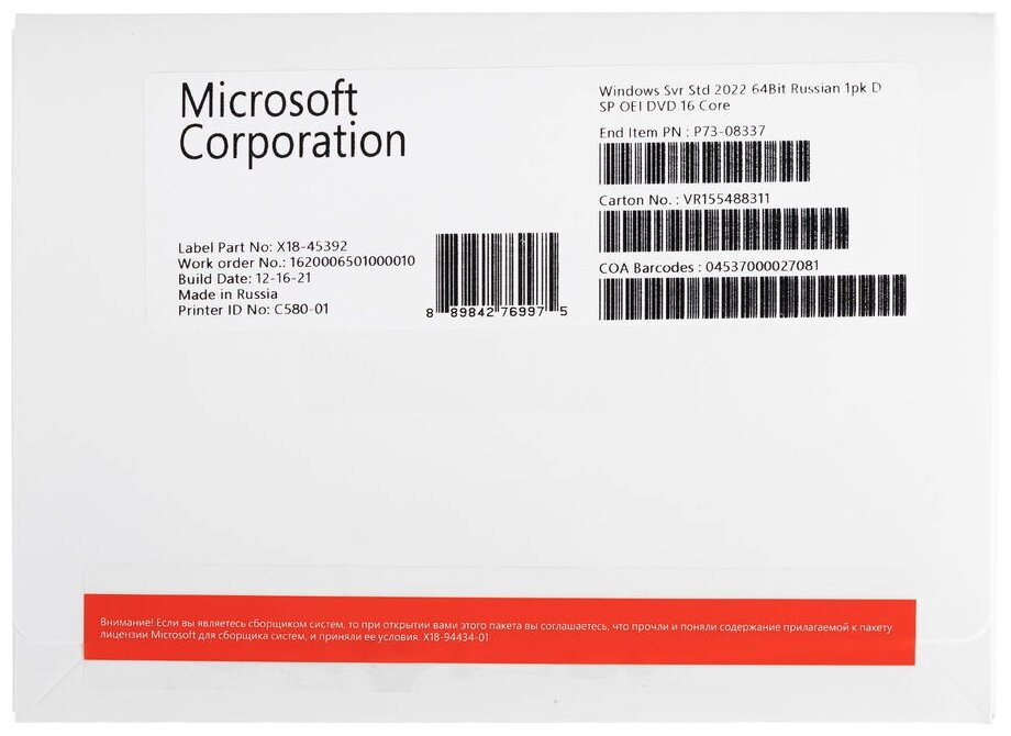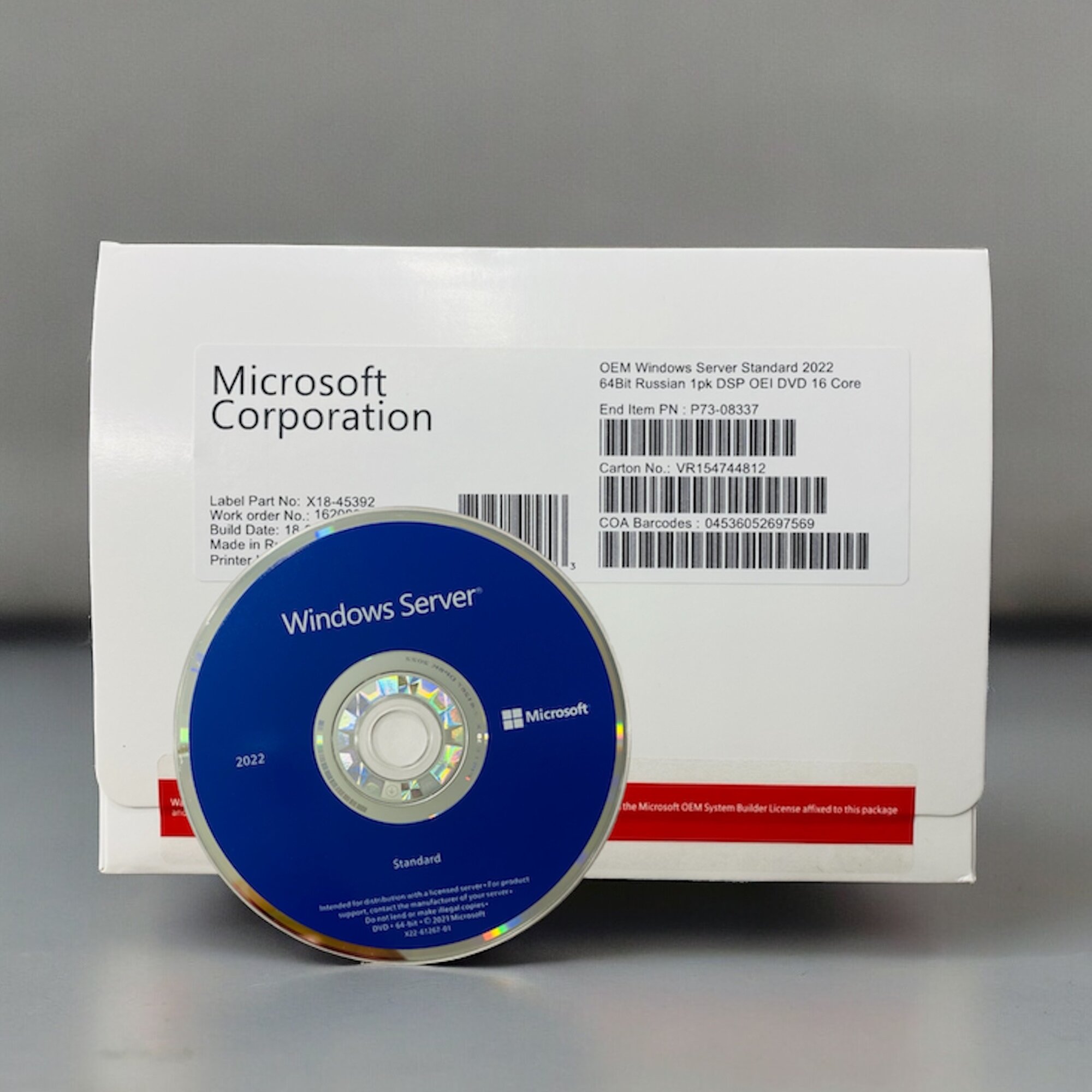 | Наименование | Windows Svr Std 2022 64Bit Russian 1pk DSP OEI DVD 16 Core |