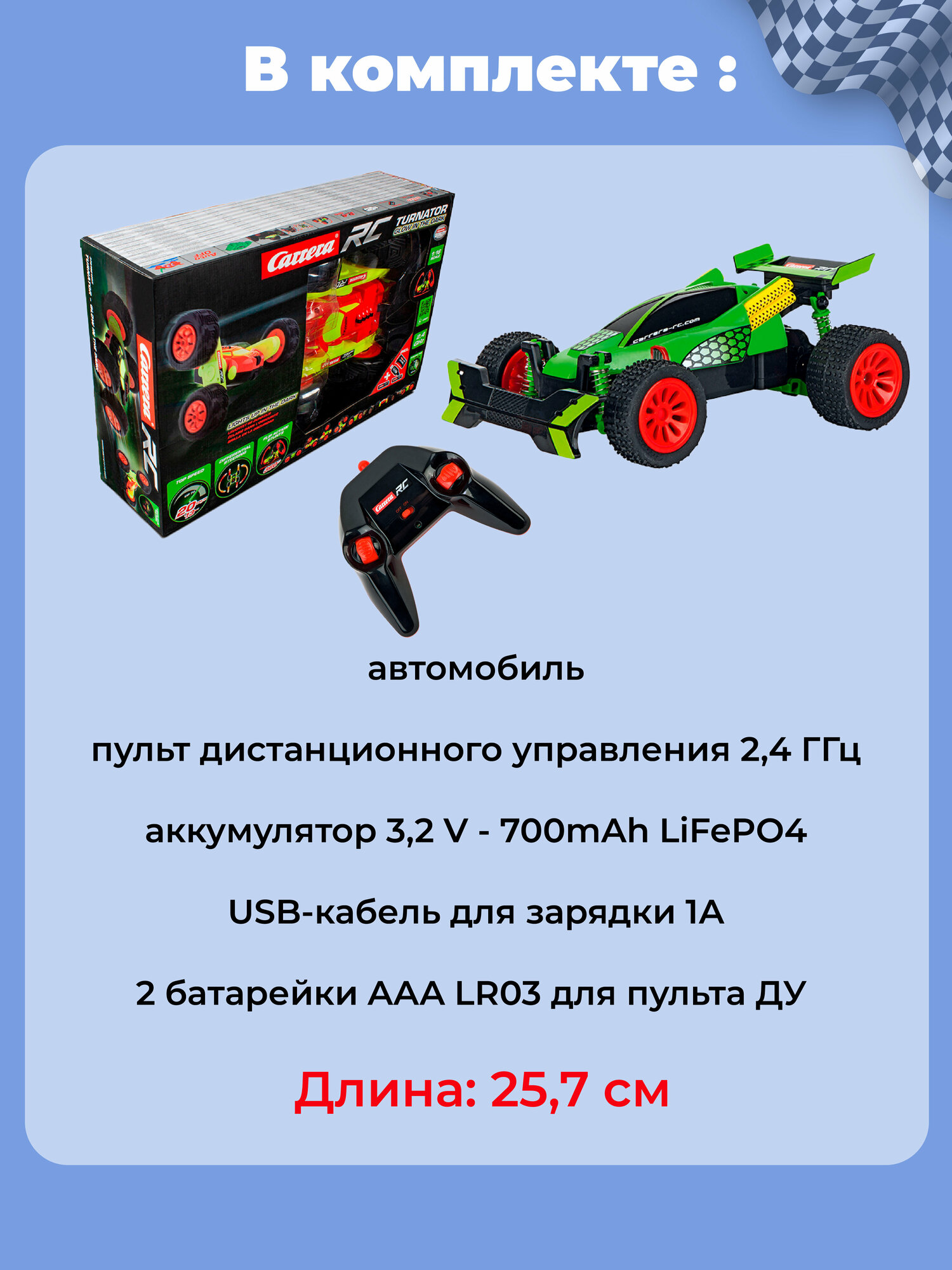 Автомобиль и пульт дистанционного управления оснащены технологией 2.4 ГГц, которая обеспечит возможность подключения к гонкам до 16 человек, так что вы сможете без проблем устроить соревнования вместе с друзьями. Яркий зеленый цвет и стилизованные детали дизайна привлекут внимание и не оставят никого равнодушным.
