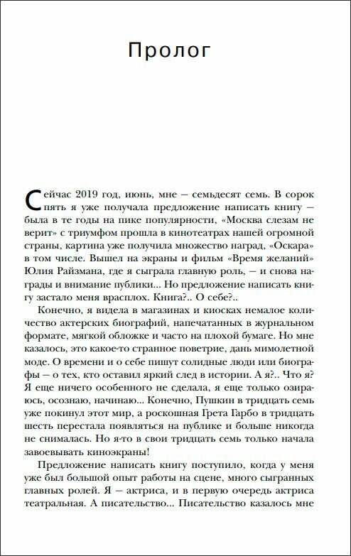 Прекрасная история прекрасной жизни захватывает с первой страницы. Сколько судеб пересеклись с судьбой Веры Валентиновны! И для каждого актера, режиссера, коллеги по работе и друга она находит добрые и очень точные слова. И, перевернув последнюю страницу, вдруг понимаешь: Вера Алентова в оскароносном фильме "Москва слезам не верит" сыграла саму себя: простую девушку, которая прошла по жизни с любовью, достоинством и оптимизмом, всего добившись сама.