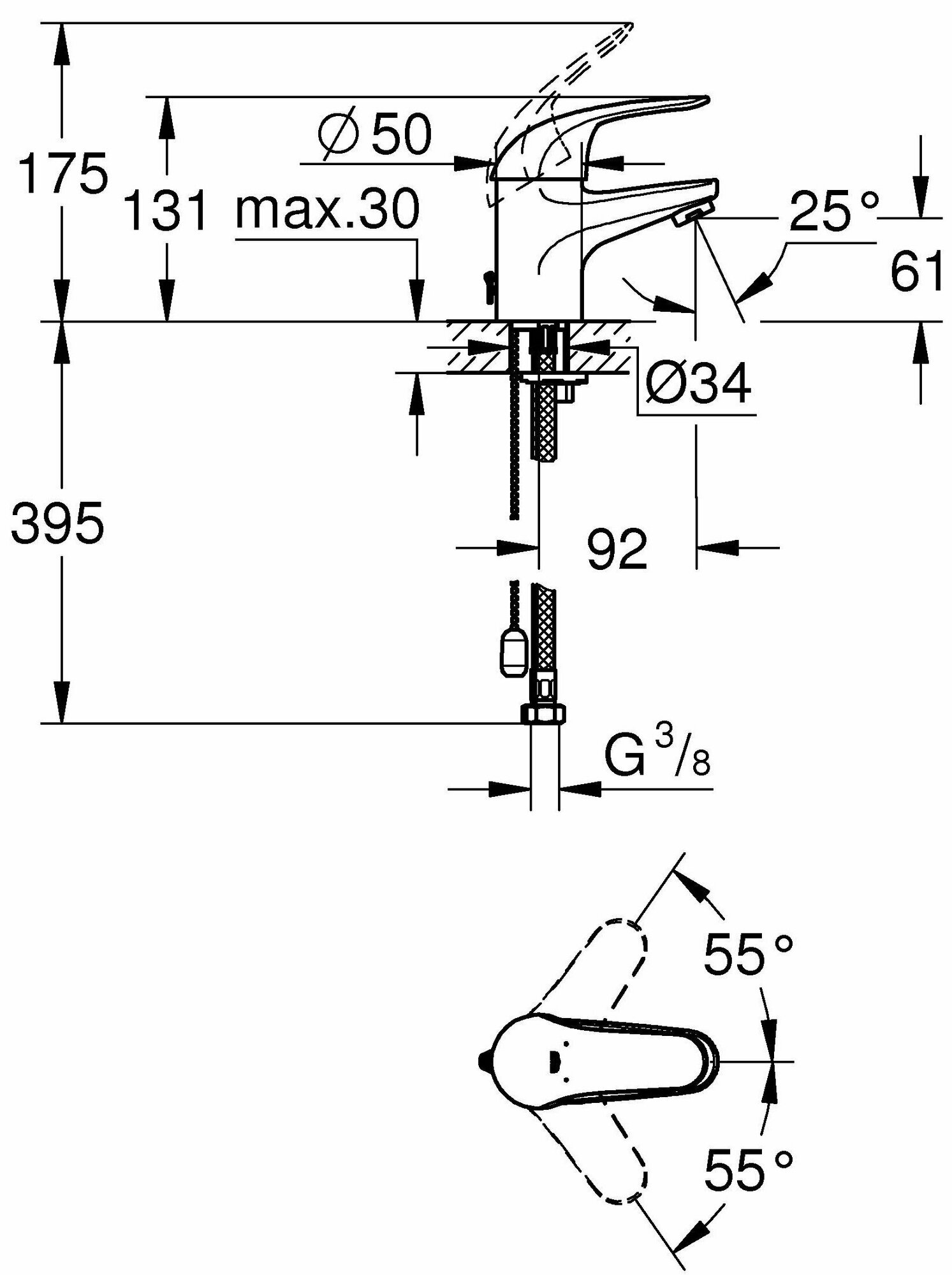 Смеситель для раковины Grohe Euroeco, с цепочкой. Цвет: хром. монтаж на одно отверстие металлический рычаг GROHE SilkMove® керамический картридж 35 мм поверхность GROHE StarLight® аэратор ограничитель потока 9 л/мин.