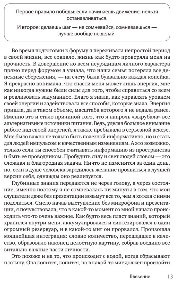 Прекрасная книга, раскрывающая все мудрости жизни, которые должен открыть для себя человек. Автор - зрелая и сильная личность. Она рассказывает обо всех "правилах" жизни так ярко и четко, потому что сама смогла открыть их для себя и принять. Автор - верующая женщина и в своей книге она часто упоминает Бога. Я не верю в Бога, однако для чего-то высшего есть и другие названия: энергия, Вселенная и т.д. Я считаю, что это не меняет главного. Эта вера нужна для осознания многих вещей, для того, чтобы смириться с одиночеством и не бояться его, понимая, что все равно не один, для того, чтобы легче принимать уроки жизни, для того, чтобы отпускать то, что уже не вписывается в твою реальность. Автор раскрыла многие новые практики для ментального здоровья, как, например, дневник благодарности и установки на позитивное мышление. Все это легко объясняется с точки зрения психологии. Не обошлось и без энергетических практик. Автор рассказывает обо всех сферах жизни, начиная, конечно же, с себя. С познания себя, с любви к себе, ведь каждый человек - зеркало. Только с любви к себе проявляется любовь к другим людям и к миру в целом. Нельзя принимать окружающий мир больше, чем принимаешь себя. Помимо огромного числа инсайтов, которые получает читать при прочтении, анализируя с этими знаниями свою жизнь сейчас или в прошлом, читатель так же получает вдохновение, новое дыхание для того, чтобы жить свою жизнь и чувствовать ее на полную, силы на новые цели или на решение старых проблем.