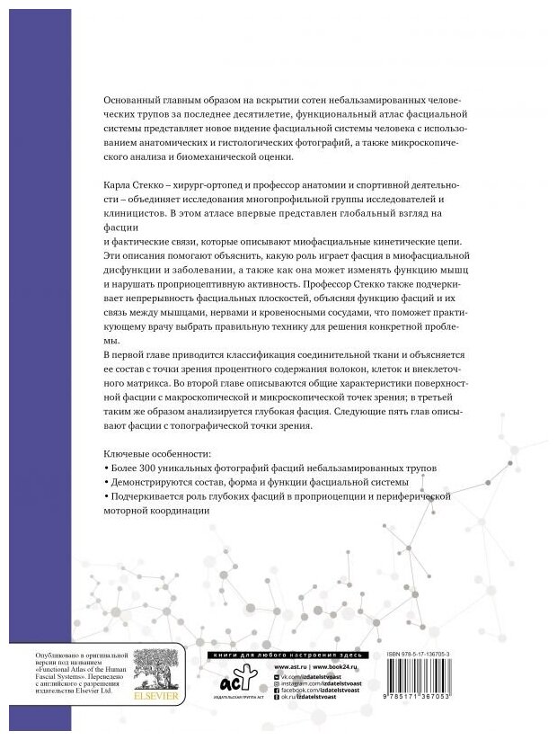Карла Стекко - хирург-ортопед и профессор анатомии и спортивной деятельности - объединяет исследования многопрофильной группы исследователей и клиницистов. В этом атласе впервые представлен глобальный взгляд на фасции и фактические связи, которые описывают миофасциальные кинетические цепи. Эти описания помогают объяснить, какую роль играет фасция в миофасциальной дисфункции и заболевании, а также как она может изменять функцию мышц и нарушать проприоцептивную активность. Профессор Стекко также подчеркивает непрерывность фасциальных плоскостей, объясняя функцию фасций и их связь между мышцами, нервами и кровеносными сосудами, что поможет практикующему врачу выбрать правильную технику для решения конкретной проблемы. В первой главе приводится классификация соединительной ткани и объясняется ее состав с точки зрения процентного содержания волокон, клеток и внеклеточного матрикса. Во второй главе описываются общие характеристики поверхностной фасции с макроскопической и микроскопической точек зрения;