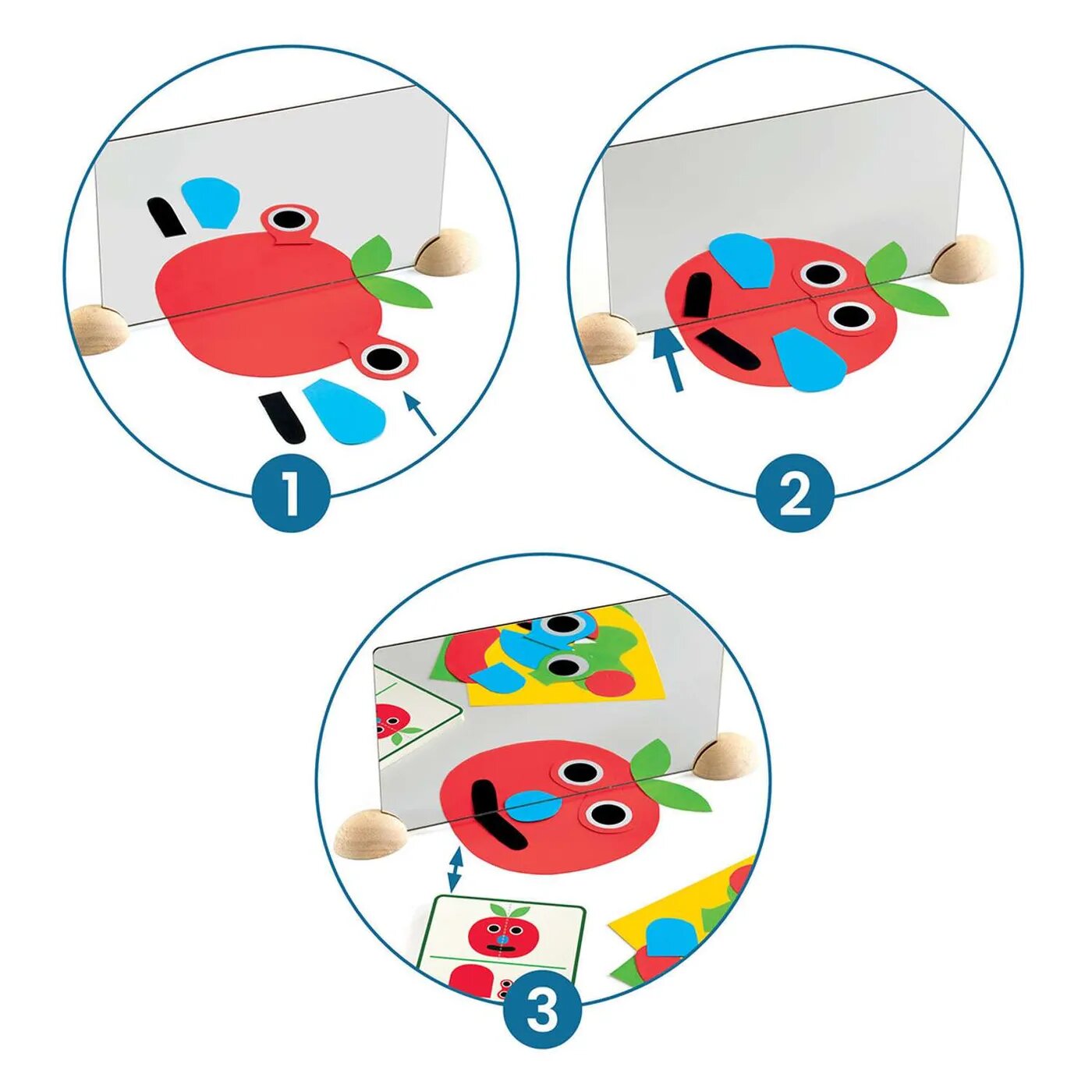 С помощью этого конструктора дети научатся играть с отражением. Ребёнок воспроизводит смешные рожицы, которые есть на карточках-примерах, сдвигая и накладывая бумажные фигурки под зеркало, которое превращает, например, обычную палочку в точку. Ребёнок по-новому экспериментирует с отражениями, перемещая фигуры под зеркалом. Всё преображается и лица оживают!