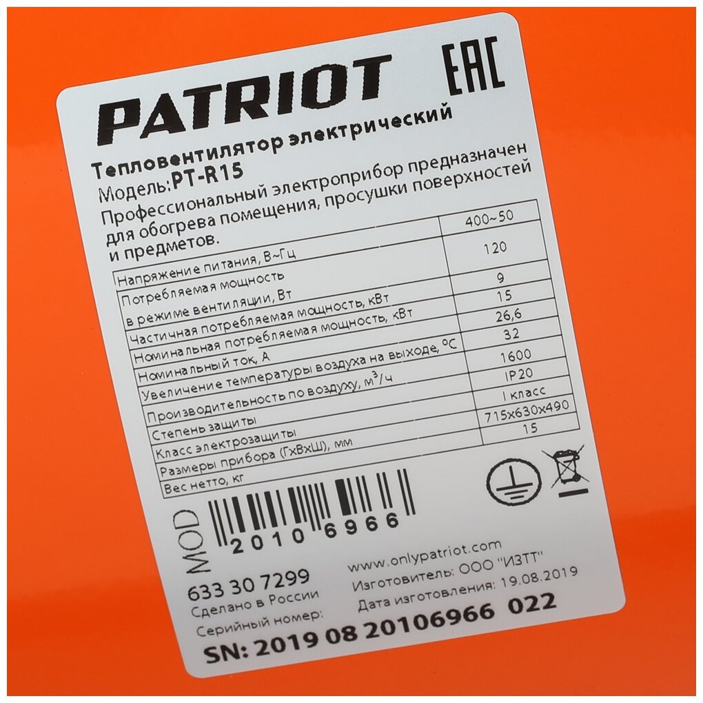 Оборудование PATRIOT PT-R 15 работает от трехфазной сети 380 В, дополняется термостатом и яркими индукторами. Пушка оснащена прочным корпусом с защитой IP20 и классом электрозащиты I. Компактный прибор удобен для обогрева мастерской, гаража или промышленного цеха.