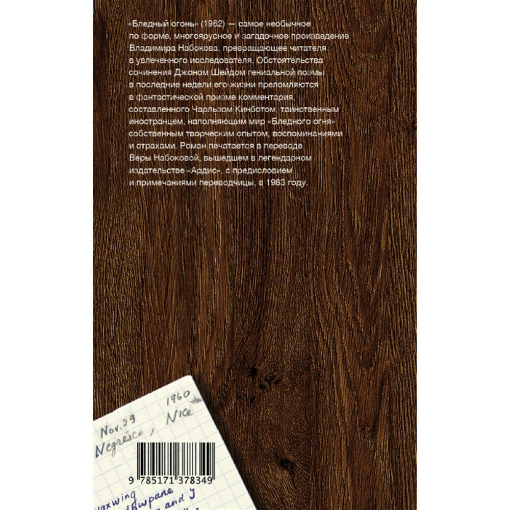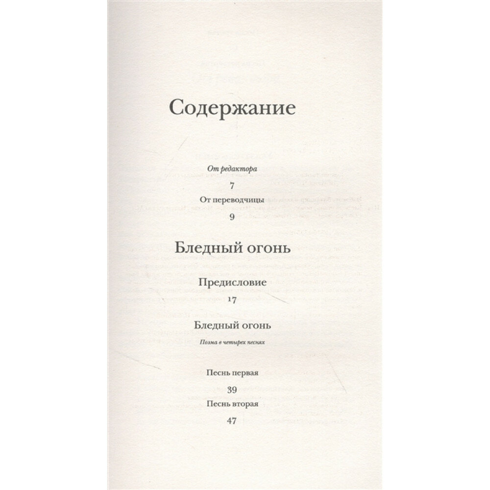Владимир Владимирович Набоков – русский писатель 20 с самым популярным произведением «Лолита». Тем не менее, его книга «Бледный огонь» также достойна внимания публики. Обложка выполнена в твердом и полностью матовом переплете, приятном на ощупь. Страницы белые с четким и удобным для глаз шрифтом.