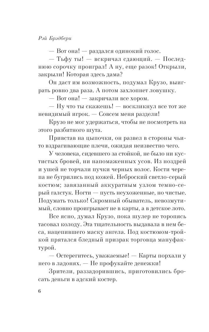 интересный сборник короткой прозы из позднего периода творчества Рэя Брэдбери... содержит рассказы как традиционной для автора фантастической и мистической тематики, так и вполне укладывающиеся в рамки реалистического жанра... к сожалению, отнюдь не все из них выдерживают привычный для Брэдбери высокий уровень сюжета и подачи, хотя - в целом демонстрируют крепкое качество литературы... издание, несмотря на мягкую обложку, довольно прочное... бумага и шрифт - приемлемые для бюджетного...