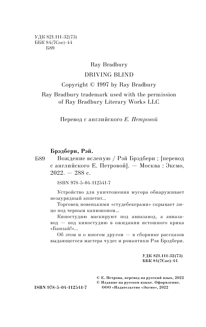 Книга: Вождение вслепую (Рэй Брэдбери); Эксмо, Редакция 1, 2022