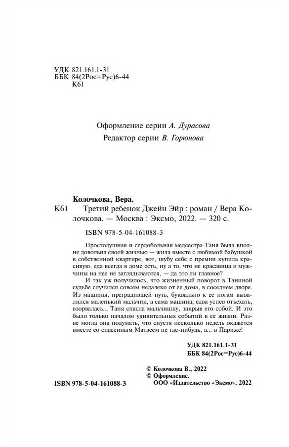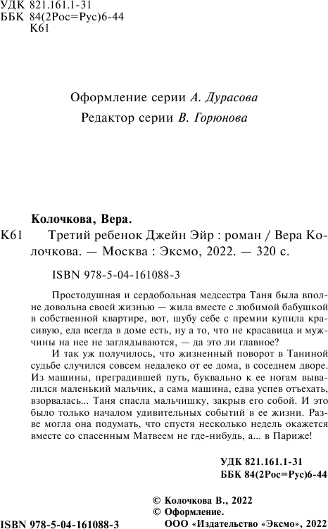 Сервис сравнения цен СкидкаГИД предлагает сравнить цены на товар «Книга: Третий ребенок Джейн Эйр (Колочкова Вера Александровна); ООО "Издательство "Эксмо", 2022»