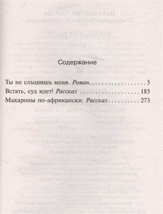 Этот сборник состоит из коротенького (на 180 страниц) романа "Ты не слышишь меня" и 2 рассказов - "Встать, суд идет" и "Макароны по-африкански". Хотя я очень люблю творчество Нестеровой, но эти переиздания старых рассказов и повестей под новыми названиями раздражают, т.к. я рассчитывала на толстенькую книжку с новым романом