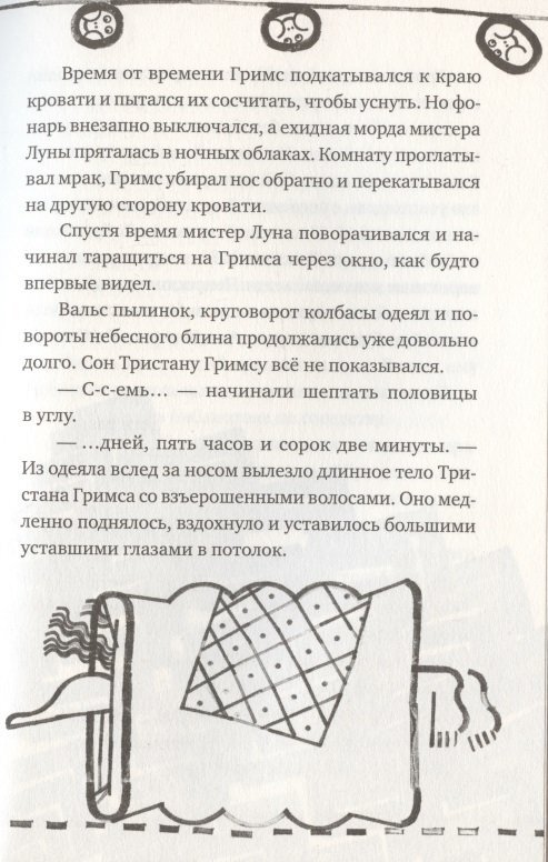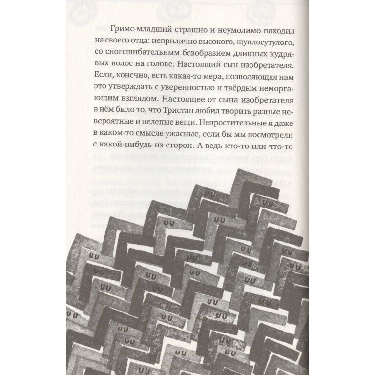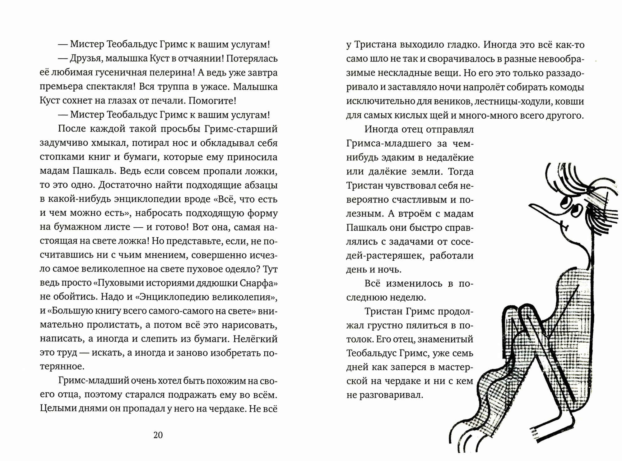 Веселая на первый взгляд и добро-грустная на все последующие - именно такая история про Тристана Гримса (с привкусом безумия шляпника Кэролла и тминовым пирогом Клюева). Отец главного героя, Теобальдус Гримс, пропал, и Тристан отправляется в путь. Он не знает, куда ему идти и как искать того, кто пропал совершенно неожиданным образом. По пути Тристан встречает гордую птичку, господина торговца шляпами, господина, собирающего пятна, комету, мышь, семейство гномов, кота без внутреннего глаза (не подходить без печений)... После себя книга оставляет приятное послевкусие, а спустя пару отвлеченных мыслей ты говоришь "АГА!", потому что понял и улыбнулся.