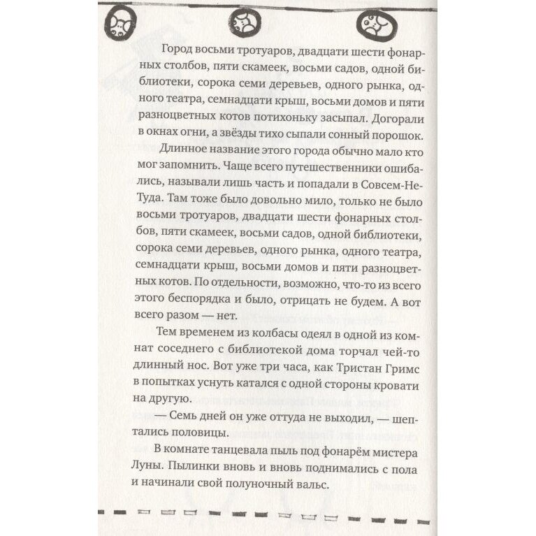 Добро пожаловать в Город восьми тротуаров, двадцати шести фонарных столбов, пяти скамеек, восьми садов, одной библиотеки, сорока семи деревьев, одного рынка, одного театра, семнадцати крыш, восьми домов и пяти разноцветных котов.
