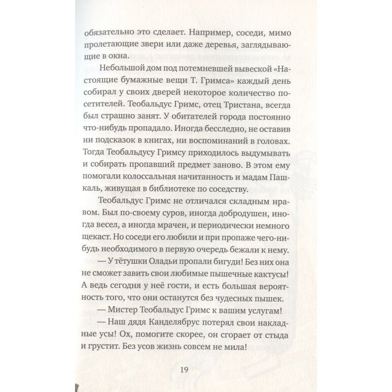 Помните, что Тени видят только тех, кто в шляпе! Поэтому прежде, чем читать “Настоящие бумажные вещи Т. Гримса”, приготовьте какой-нибудь головной убор. Тристан Гримс, главный герой, отправляется на поиски отца. Путь будет непростым и интересным! Вы познакомитесь с очаровательными гномами, с гордой Лили фон Баукмяук, таинсвтвенной Фантасмой и многими-многими другими. Комета расскажет про свое путешествие, а коты, если их угостить печеньем, приведут вас в нужное место. В книге вы найдете немало советов: если кто-то чихает, стоит его ободрить, или когда “кто-то заканчивается”, для него нет ничего лучше, чем слушать океан на берегу и считать песчинки. Тут ночь черничным вареньем облепивает комнату и сонно поглаживает ветром утренние крыши домов.