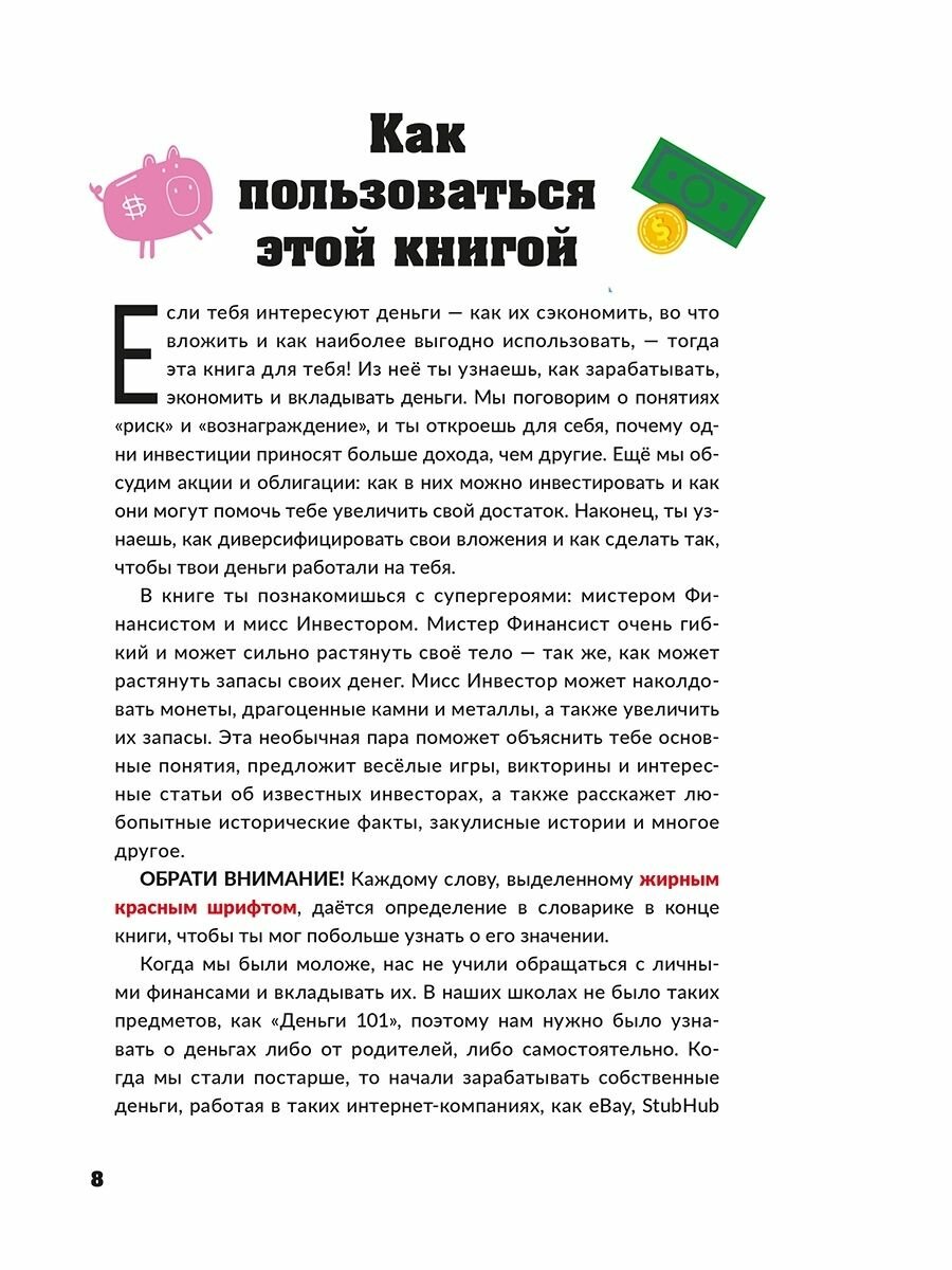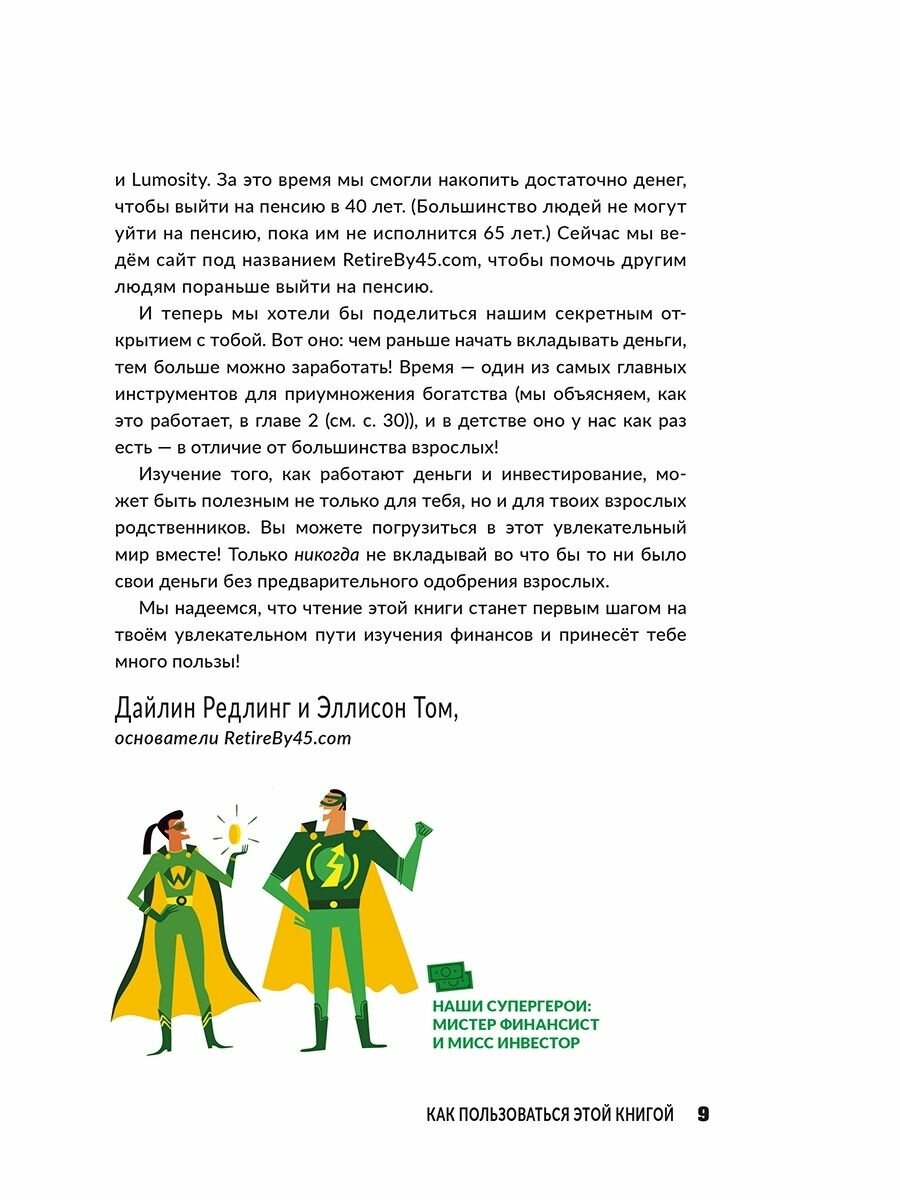 Скажи "Пока!" своей копилке - и задумайся об инвестированииЧем раньше ты начнёшь разбираться в деньгах, тем скорее у тебя их станет больше. Это чистая правда! Книга поможет тебе понять, как функционируют деньги, подскажет, как их заработать, создать план накопления сбережений, и предложит лучшие способы инвестирования в будущее.Главные герои этого увлекательного руководства ? суперкоманда, состоящая из мистера Финансиста и мисс Инвестор, ? расскажут тебе, что такое акции и облигации, как в них можно инвестировать и каким образом они могут сделать тебя богаче. Ты познакомишься с понятиями "риск" и "вознаграждение", а ещё узнаешь, как диверсифицировать свой инвестиционный портфель и сделать так, чтобы твои накопления росли."Инвестирование для детей" - это:- Практические советы: узнай о современных методах инвестирования, таких как целевое социальное инвестирование и биржевая торговля онлайн.- Ориентация на детей: познакомься с примерами из реальной жизни и узнай об известных инвесторах и исторических событиях.- Подведение итогов после каждой главы: погрузись в интерактивные занятия и обсуждения, в которых могут участвовать как дети, так и их родители.Это прекрасное чувство - иметь возможность помогать людям, которые в этом нуждаются. Заниматься благотворительностью - значит предлагать другим своё время, ресурсы или деньги. Часто всё начинается с небольших добрых поступков: например, ты можешь помочь младшему брату завязать шнурки или накрыть на стол к ужину. Такие бескорыстные поступки также произрастают из чувства благодарности: когда ты радуешься тому, что есть в твоей жизни, проще заметить тех, кому повезло меньше.Дайлин Редлинг и Эллисон Том - супружеская пара, живущая в Окленде, штат Калифорния. Их книги и веб-сайт RetireBy45. comмотивируют и дают советы по достижению финансовой независимости. Авторы публиковались в Forbes, CNBC и многих других изданиях. До своего раннего выхода на пенсию в 2015 году Дайлин был профессионалом в области интернет-маркетинга, а Эллисон - техническим менеджером проектов. Эллисон выросла в Нью-Йорке и окончила Дартмутский университет. Дайлин окончил Государственный университет Огайо.Для среднего школьного возраста.
