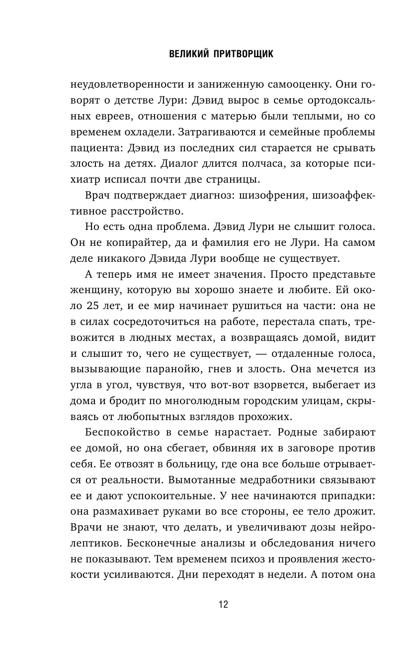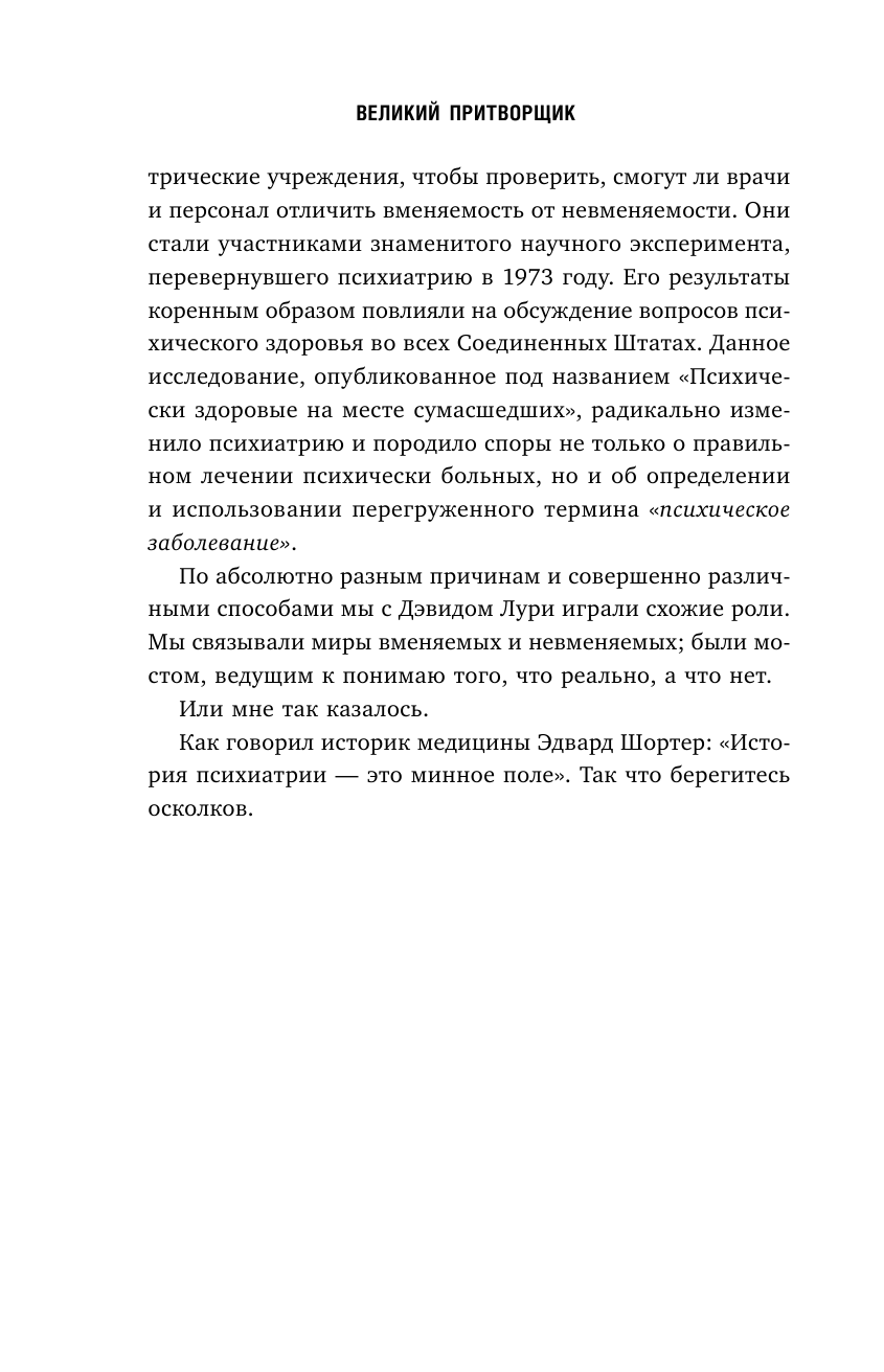 «Великий притворщик» — это широкий взгляд на индустрию психического здоровья, журналистское расследование сродни остросюжетному детективу, в центре которого — фигура, изменившая современную психиатрию и скандальный эксперимент, в котором психически здоровые люди притворяются безумцами.