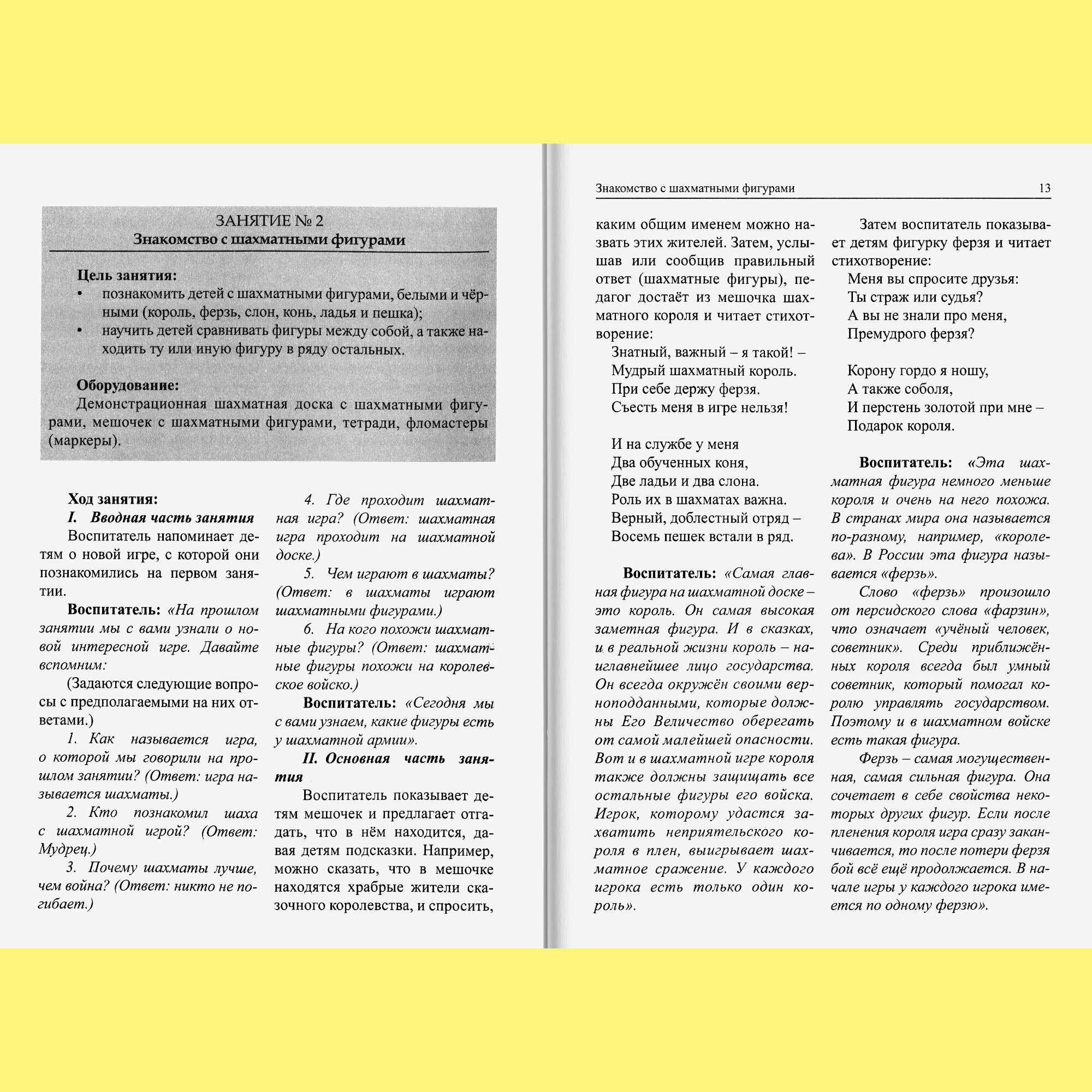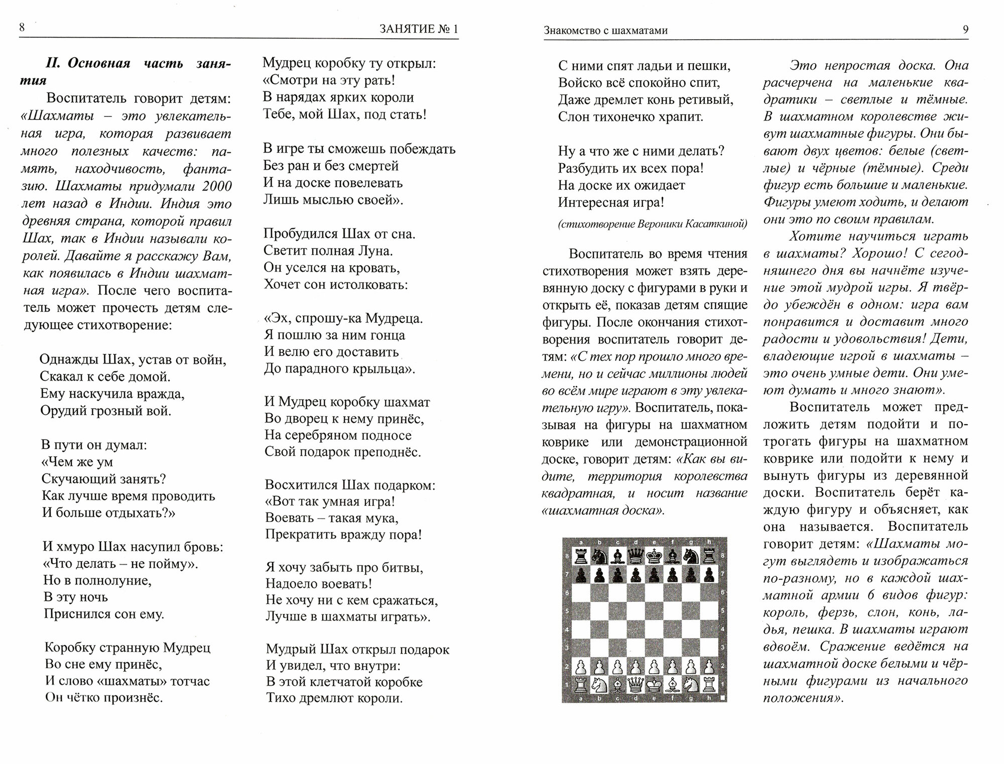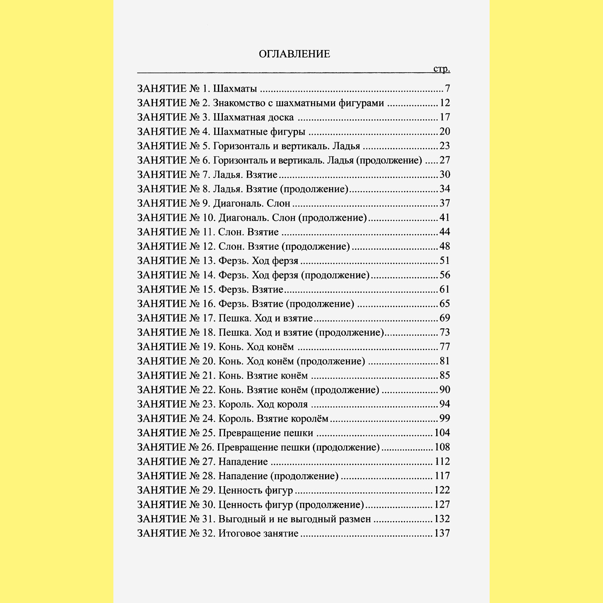 По этой книге родители и воспитатели, не имеющие шахматных знаний, смогут проводить индивидуальные и групповые занятия с детьми от 4 до 9 лет. Книга постепенно в игровой форме знакомит детей с правилами шахмат. Каждое занятие подробно расписано и включает развивающие игры, загадки и стихи. В учебнике 32 занятия, изучив которые ребёнок сможет узнать, что такое шахматы, как ходят и бьют фигуры, какие фигуры взять выгоднее и почему.