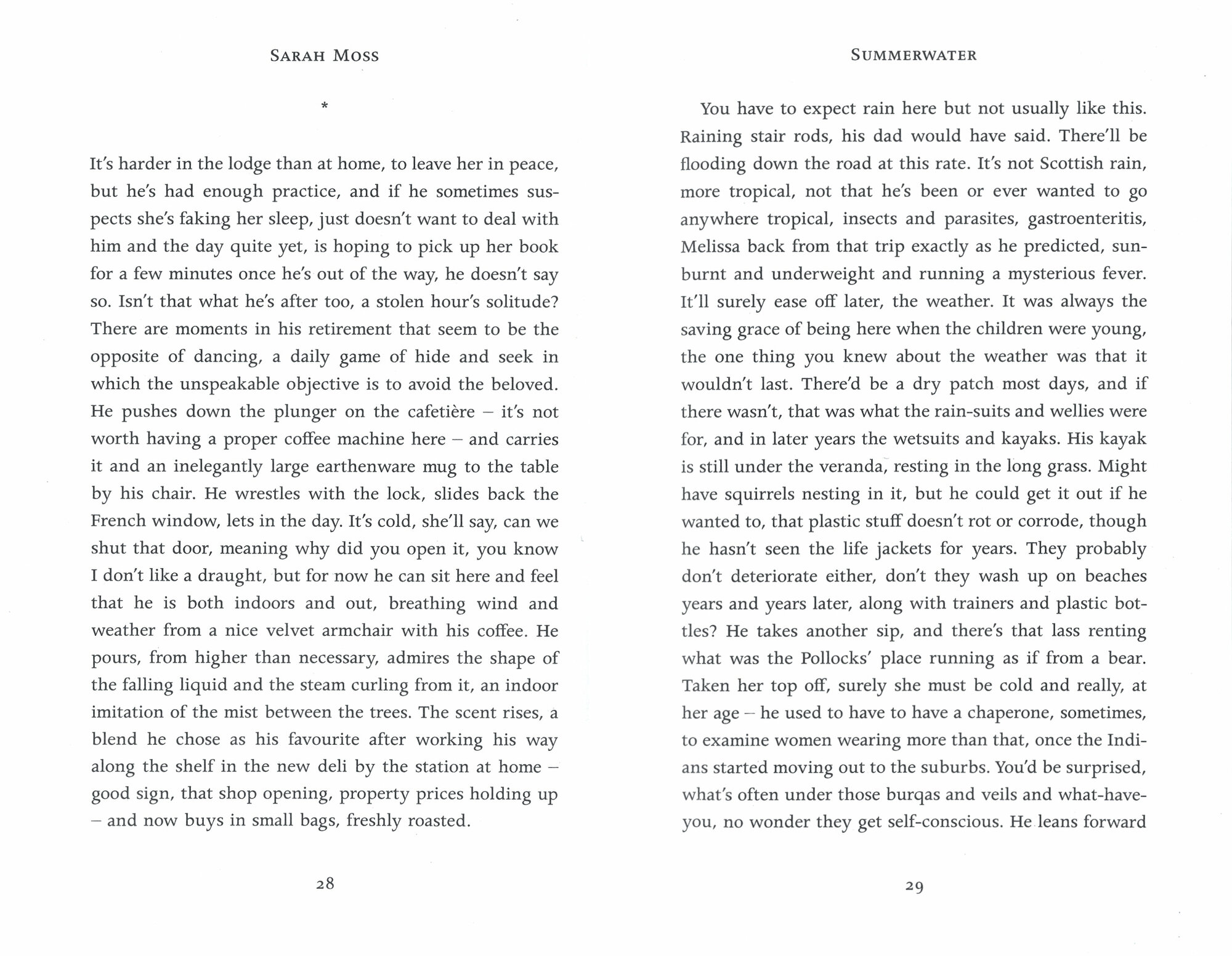 “Саммервотер” - роман Сары Мосс, описывающий истории 12 людей во время их летних каникул в Шотландии. Они проводят время в коттеджном поселке на берегу озера, каждый со своими проблемами и переживаниями. Важной частью сюжета является изоляция персонажей и подозрительное отношение к шумной семье, устраивающей вечеринки. Увлекательная книга, временами созерцательная, временами веселая, и ее стоит прочитать только из-за атмосферной прозы Мосс.