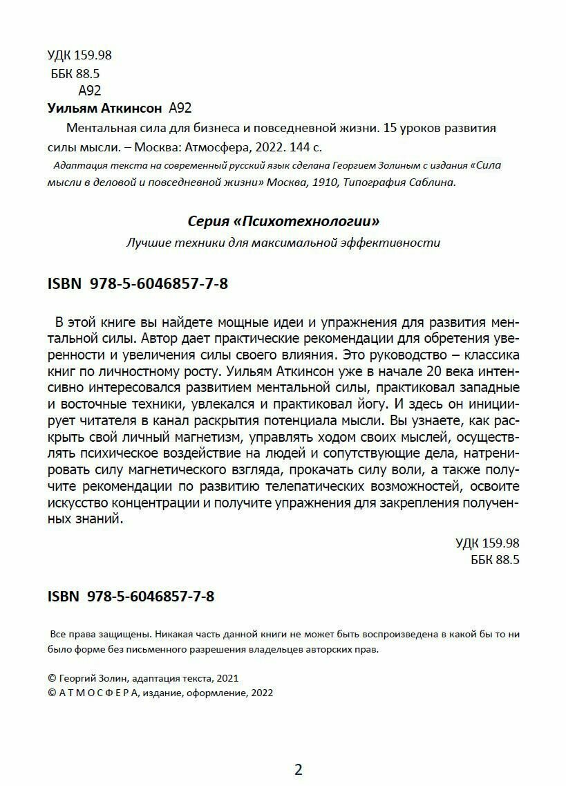 Ментальная сила для бизнеса и повседневной жизни 15 уроков развития силы мысли (Аткинсон Уильям Уокер); Атмосфера, 2022