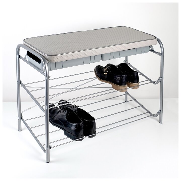 Напольная подставка для обуви. В любых помещениях дом, офис, гараж, общепит. Материал: Стальная труба диаметром 10 и 16 мм; пластиковые заглушки; полимерно-порошковое покрытие; ДСП 10 мм; поролон. Сборно-разборная. Вместительная подставка с 2-мя полками и обувным ящиком. Наличие сиденья увеличивает полезность изделия. Классическая форма. При правильной эксплуатации срок службы 10 лет. Подставка для обуви 2-полочная с сиденьем впишется практически в любой интерьер. На ней Вы сможете разместить до 10 пар обуви. Разборная конструкция позволяет приобрести данное изделие в коробке. Схема сборки изделия присутствует в комплектации. Металлический усиленный каркас. Три полки для хранения обуви. Пластиковые колпачки на ножках защищают поверхность пола от царапин. Сборка производится с использованием инструментов. Габариты этажерки (ДхШхВ) 790х330х500 мм. Размер сиденья 740х305 (ДхШ), мм. Материал сиденья МДФ. Maкс. нагрузка, кг 100. Сделано в России.