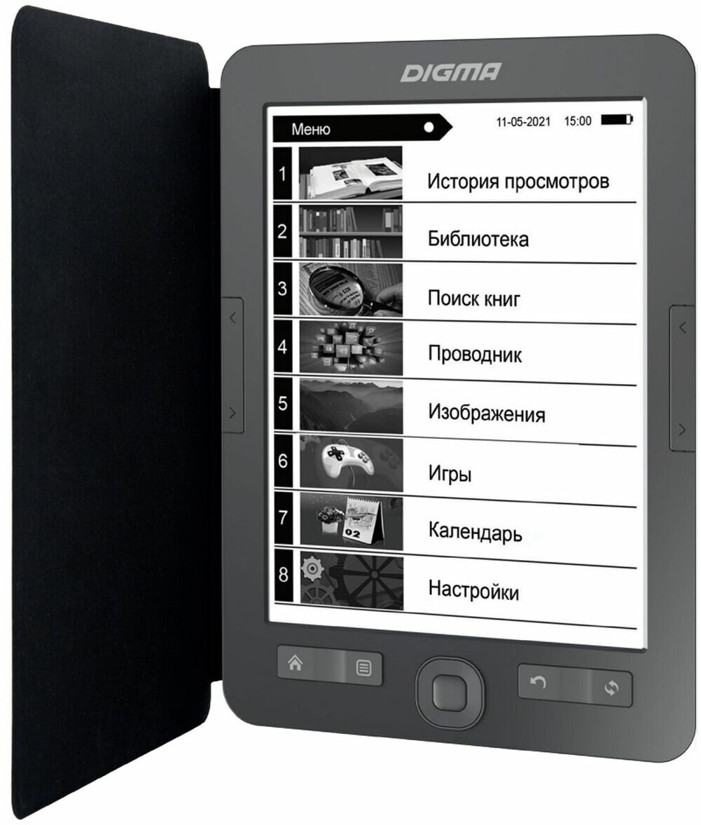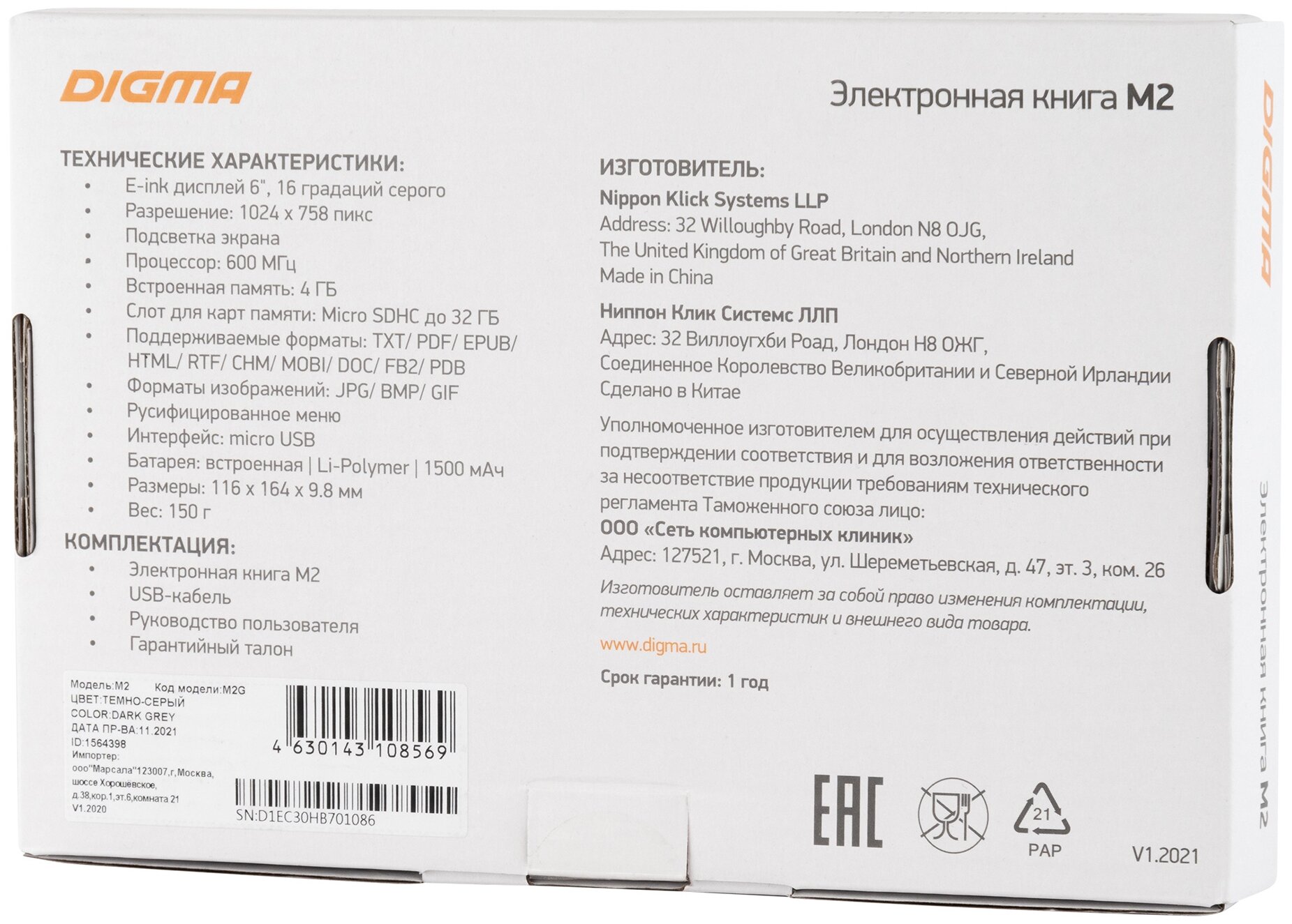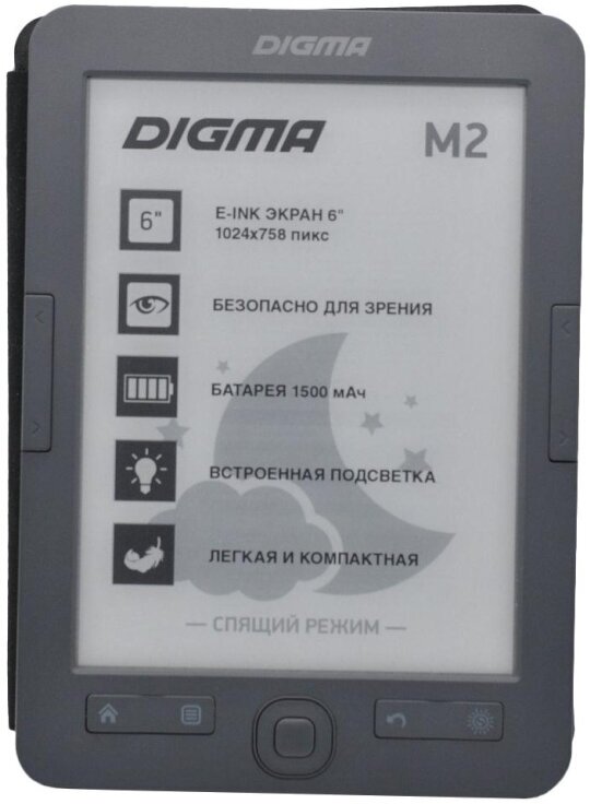 Электронная книга DIGMA M2 – верный друг любителей литературы. В комплект входит обложка: защищает книжку от царапин и превращает ее в модный аксессуар. Подсветка дисплея позволяет наслаждаться читалкой независимо от освещения, в любое время суток. Электронная книжка поддерживает самые популярные форматы изображения и текста. Вес 150 г и небольшие размеры дают возможность всегда брать с собой устройство и иметь под рукой сотни книг: не потребуется много места при хранении. Устройство выполнено в темно-сером цвете и минималистичном дизайне. Корпус изготовлен из долговечного, прочного пластика. 16 градаций серого оттенка повышает качество картинки. Аккумулятор емкостью 1500 мАч позволит долго наслаждаться чтением в автономном режиме. Низкий расход электроэнергии дает возможность реже подзаряжать читалку: полного заряда хватит больше чем на месяц. Для подзарядки есть интерфейс micro-USB. Встроенная память объемом 4 Гб поможет хранить до 4000 любимых книг. Слот для карт памяти формата microSDHC объемом 32 Гб обеспечивает расширение виртуальной библиотеки. Технология E-Ink Pearl HD имитирует печатную бумагу: свободный угол обзора, безопасность для зрения, никакой усталости глаз. Электронная книга DIGMA M2 поможет не расставаться с любимыми романами и детективами. Дисплей с высоким разрешением 1024 х 758 и диагональю 6” позволит получить больше удовольствия от чтения книжек и просмотра изображений.