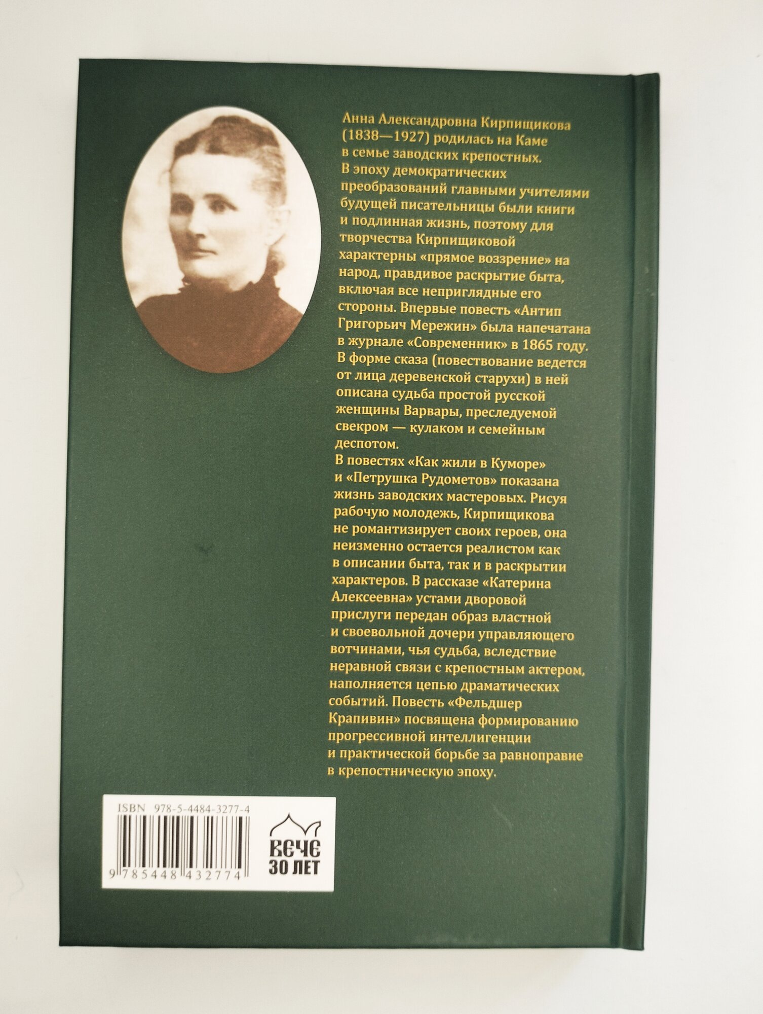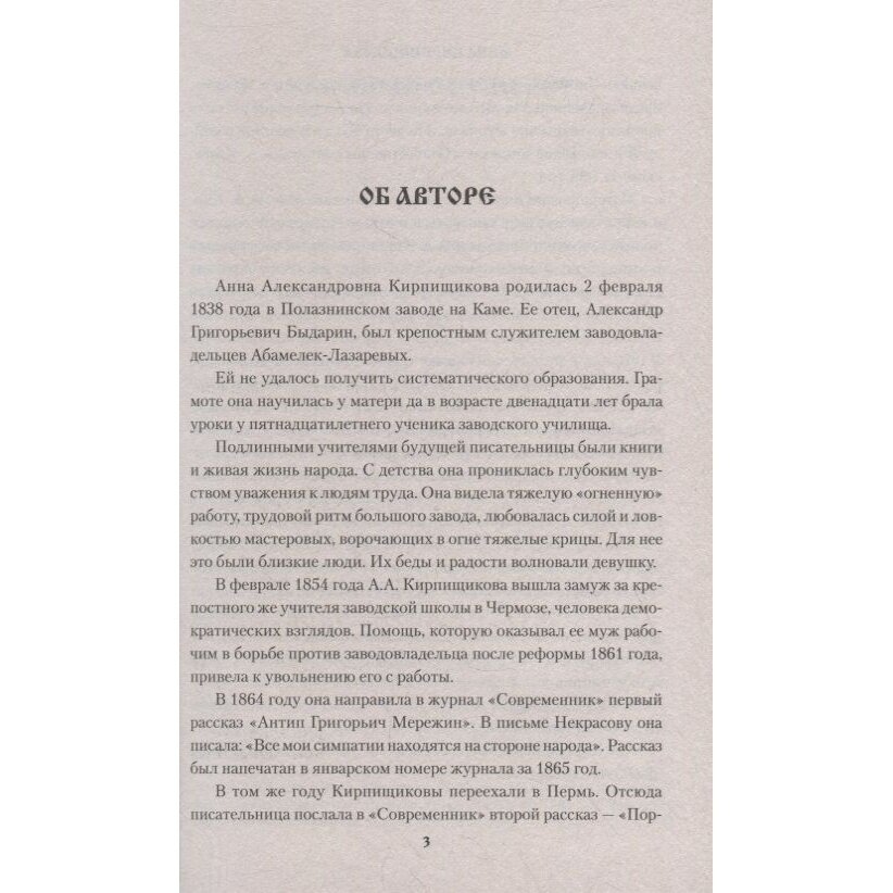 Анна Александровна Кирпищикова (1838-1927) родилась на Каме в семье заводских крепостных. В эпоху демократических преобразований главными учителями будущей писательницы были книги и подлинная жизнь, поэтому для творчества Кирпищиковой характерны "прямое воззрение" на народ, правдивое раскрытие быта, включая все неприглядные его стороны. Впервые повесть "Антип Григорьич Мережин" была напечатана в журнале "Современник" в 1865 году. В форме сказа (повествование ведется от лица деревенской старухи) в ней описана судьба простой русской женщины Варвары, преследуемой свекром - кулаком и семейным деспотом. В повестях "Как жили в Куморе" и "Петрушка Рудометов" показана жизнь заводских мастеровых. Рисуя рабочую молодежь, Кирпищикова не романтизирует своих героев, она неизменно остается реалистом как в описании быта, так и в раскрытии характеров. В рассказе "Катерина Алексеевна" устами дворовой прислуги передан образ властной и своевольной дочери управляющего вотчинами, чья судьба, вследствие неравной связи с крепостным актером, наполняется цепью драматических событий. Повесть "Фельдшер Крапивин" посвящена формированию прогрессивной интеллигенции и практической борьбе за равноправие в крепостническую эпоху.