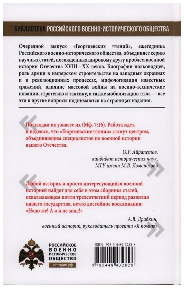 Очередной выпуск "Георгиевских чтений", ежегодника Российского военноисторического общества, объединяет серию научных статей, посвященных широкому кругу проблем военной истории Отечества XVIII-XX веков. Биографии полководцев, роль армии в имперском строительстве на западных окраинах и революционных процессах, мифологизация известных сражений, влияние массовой войны на военнотехнические новации, стратегию и тактику, а также мобилизацию тыла, - все эти и другие вопросы подымаются на страницах изданиях.