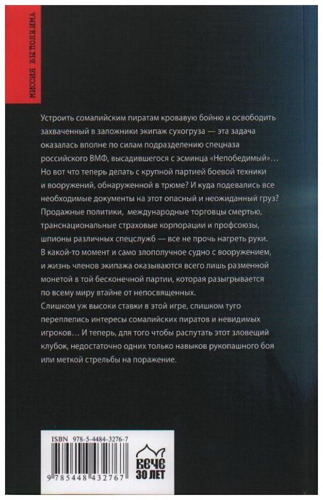 Устроить сомалийским пиратам кровавую бойню и освободить захваченный в заложники экипаж сухогруза - эта задача оказалась вполне по силам подразделению спецназа российского ВМФ, высадившегося с эсминца "Непобедимый"… Но вот что теперь делать с крупной партией боевой техники и вооружений, обнаруженной в трюме? И куда подевались все необходимые документы на этот опасный и неожиданный груз?