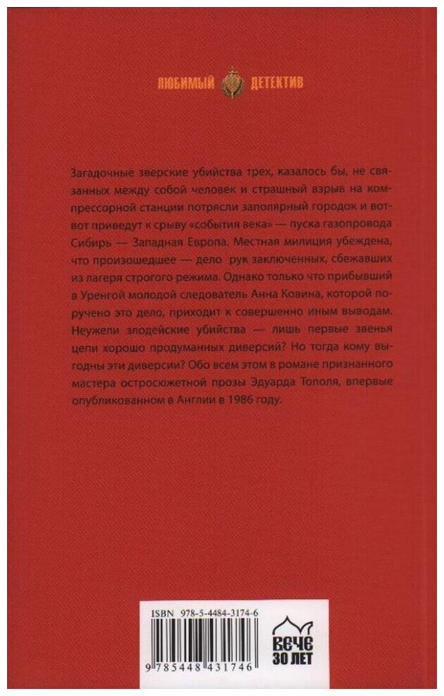 Загадочные зверские убийства трех, казалось бы, не связанных между собой человек и страшный взрыв на компрессорной станции потрясли заполярный городок и вот-вот приведут к срыву "события века" - пуска газопровода "Сибирь - Западная Европа". Местная милиция убеждена, что произошедшее - дело рук заключенных, сбежавших из лагеря строгого режима. Однако только что прибывший в Уренгой молодой следователь Анна Ковина, которой поручено это дело, приходит к совершенно иным выводам. Неужели злодейские убийства - лишь первые звенья цепи хорошо продуманных диверсий? Но тогда кому выгодны эти диверсии? Обо всем этом в романе признанного мастера остросюжетной прозы Эдуарда Тополя, впервые опубликованном в Англии в 1986 году.
