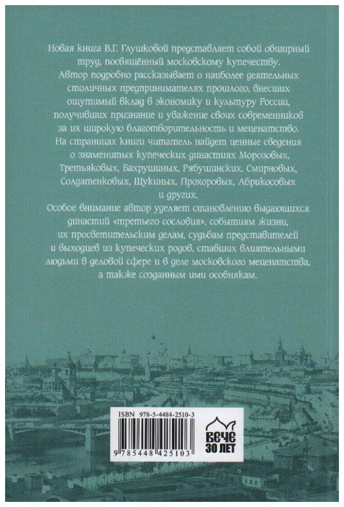 Новая книга В.Г. Глушковой представляет собой обширный труд, посвящённый московскому купечеству. Автор подробно рассказывает о наиболее деятельных столичных предпринимателях прошлого, внесших ощутимый вклад в экономику и культуру России, получивших признание и уважение своих современников за их широкую благотворительность и меценатство. На страницах книги читатель найдет ценные сведения о знаменитых купеческих династиях Морозовых, Третьяковых, Бахрушиных, Рябушинских, Смирновых, Солдатенковых, Щукиных, Прохоровых, Абрикосовых и других.