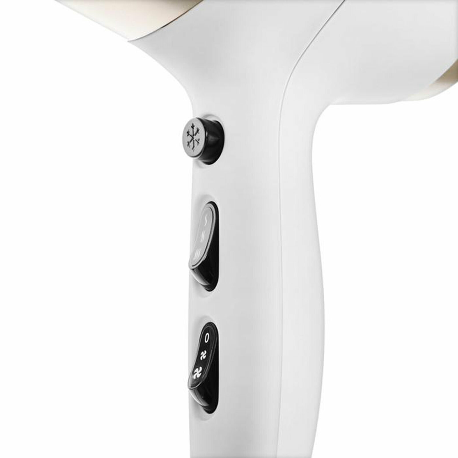 В комплекте — две насадки: диффузор и концентратор. Первая обладает круглой формой большого диаметра с зубчиками по кругу и служит для создания пышных укладок. Вторая создает узкий поток воздуха. Для безопасности предусмотрено отключение при перегреве. Защитная решетка съемная. Длина сетевого кабеля — 1,65 м. Размеры устройства составляют 24х9,5х25 см, вес — 0,5 кг.