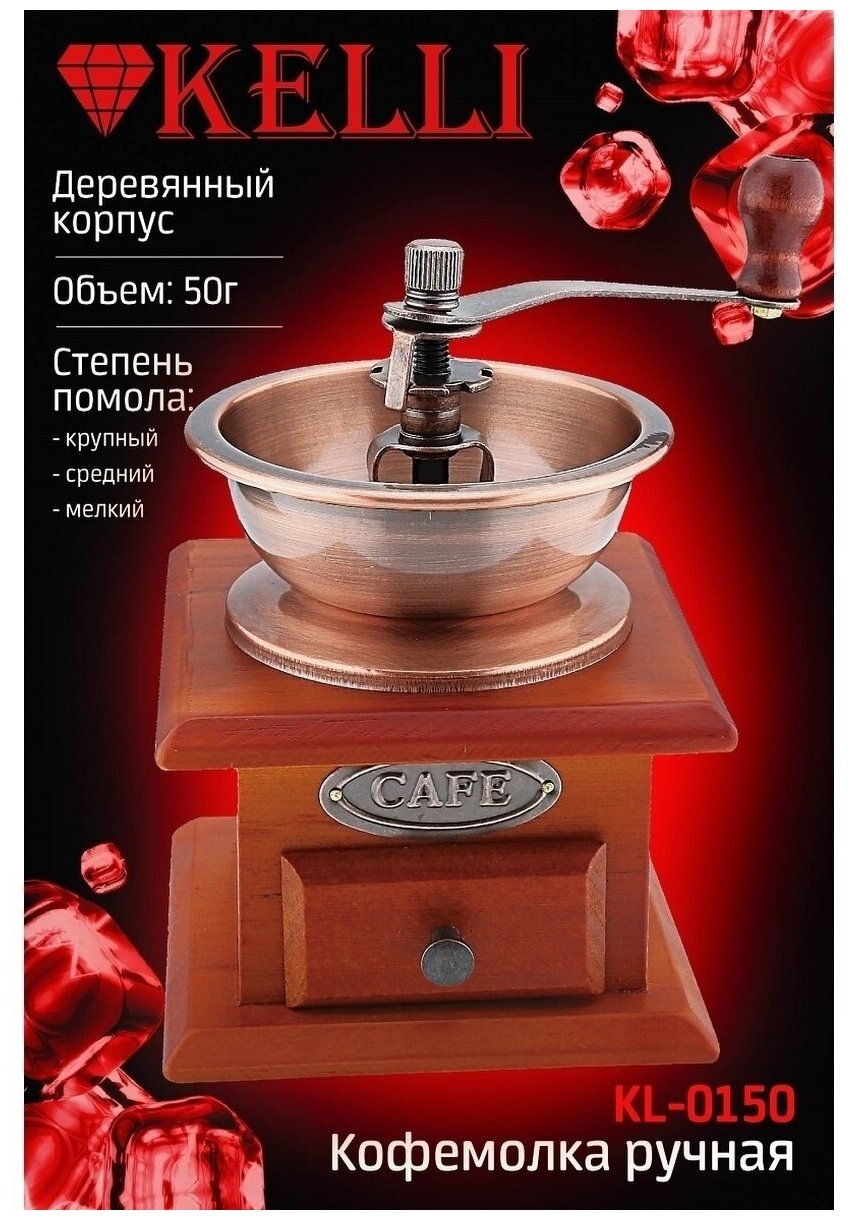 Кофемолка ручная - , KL-0151. Объем: 50г. Степень помола: крупный, средний, мелкий. Деревянный корпус. Металлическая чаша для помола. Материал корпуса выполнен из экологический материалов. Оригинальный дизайн корпус с выдвижным ящиком. В зависимости от Вашего желания, помол кофейных зерен может быть выполнен в трех разных степенях - от мелкого до крупного. Это возможно с помощью регулировочного кольца. Снимите верхний винт, а также ручку и зажим. Поверните регулировочное кольцо по часовой стрелке для мелкого помола и против часовой для крупного. Обратите внимание, что регулировочное кольцо должно быть установлено на расстоянии 0,25 мм от основания, во избежание засора.