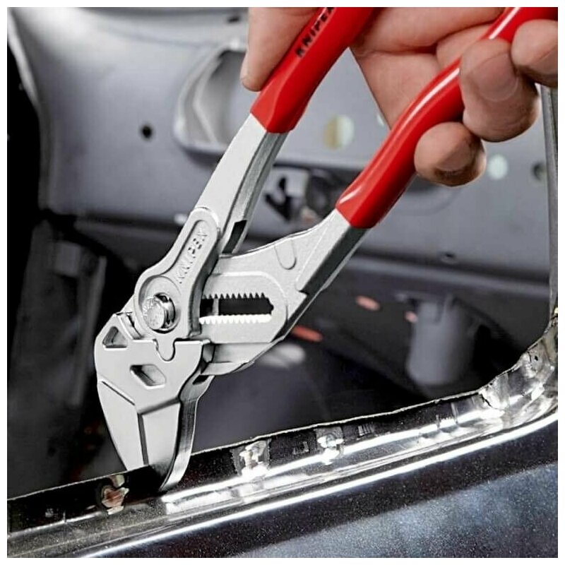| Прочие особенности и свойства | Клещевой ключ KNIPEX KN-8605180 используется для различных видов работ:опрессовка, сжатие и изгибание деталей, обламывание кафельной плитки и пр. Данный инструмент может работать как с зазором между захватными плоскостями (принцип трещоточного ключа) для быстрого отворачивания или заворачивания крепежных деталей, так и с безлюфтовым контактом по всей плоскости губок для работы с чувствительными поверхностями. |