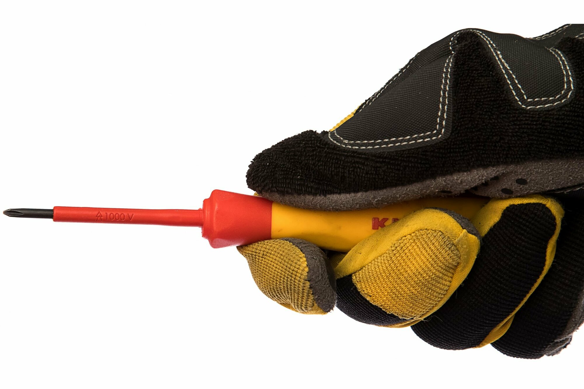 Крестообразная отвертка KNIPEX оснащена удобной рукояткой из многокомпонентного материала, благодаря которой происходит оптимальная передача усилия при работе. Изготовлена из прочной хромованадиевой стали и прослужит в течение долгого времени. Диэлектрическое покрытие изолированной ручки позволяет работать под напряжением до 1000 В, что соответствует нормам IEC (МЭК) 60900.