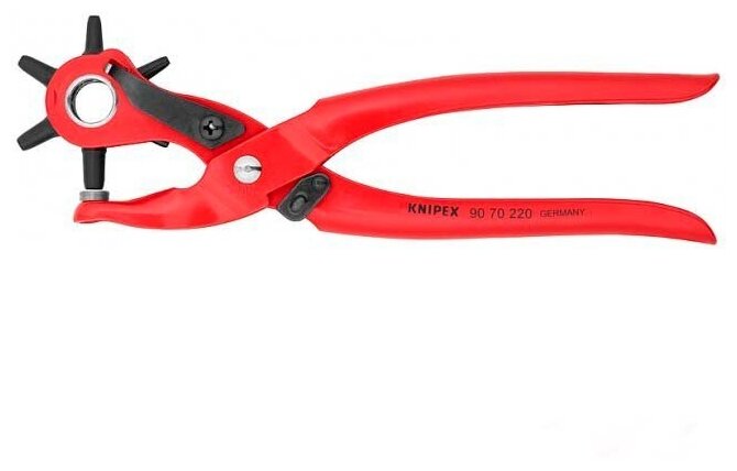 90 70 220 Просекатель с револьверной головкой для просекания отверстий в коже, текстильных материалах и пластмассах. с 6 сменными пуансонами, Ø 2,0 / 2,5 / 3,0 / 3,5 / 4,0 / 5,0 мм. С раскрывающей пружиной и замком. окрашены порошковой краской для защиты от коррозии.