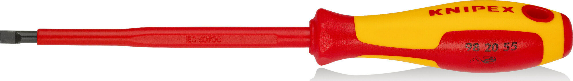 Отвертка KNIPEX изготовлена из прочной хромованадиевой стали, закаленной в масле, благодаря чему инструмент прослужит в течение долгого времени. Изолированная ручка отвертки выполнена из многокомпонентного материала, прошедшего испытания по нормативам VDE. Инструмент имеет диэлектрическое покрытие, поэтому им можно работать под напряжением переменного тока до 1000 В. Длина стержня 125 мм Длина рукояти 107 мм