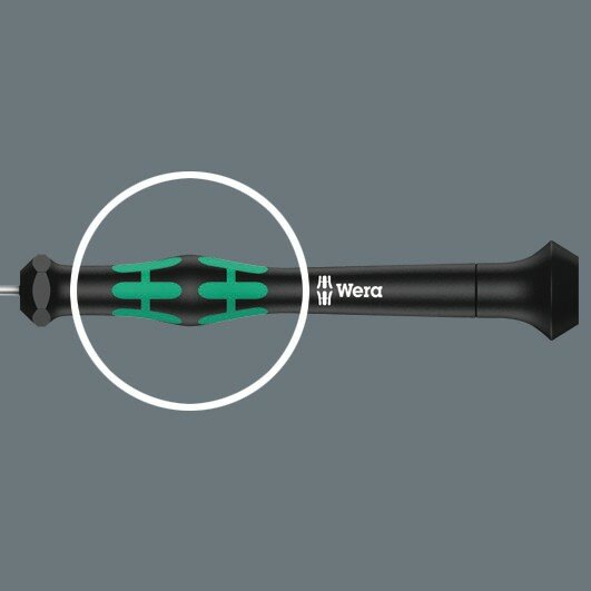 Высококачественная отвёртка Wera Micro для тонкой работы. За счёт опоры ладони на подвижную головку и расположенной под ней зоны быстрого вращения можно работать отвёрткой в скоростном режиме. Не надо тратить время на перехватывание инструмента. Зона приложения усилий с мягкими участками служит для передачи больших моментов силы при затяжке и отпуске винтов. Прецизионная зона для выбора правильного угла завинчивания при юстировочных работах. Наконечник Wera Black Point обеспечивает точность работы и оптимальную защиту от коррозии.