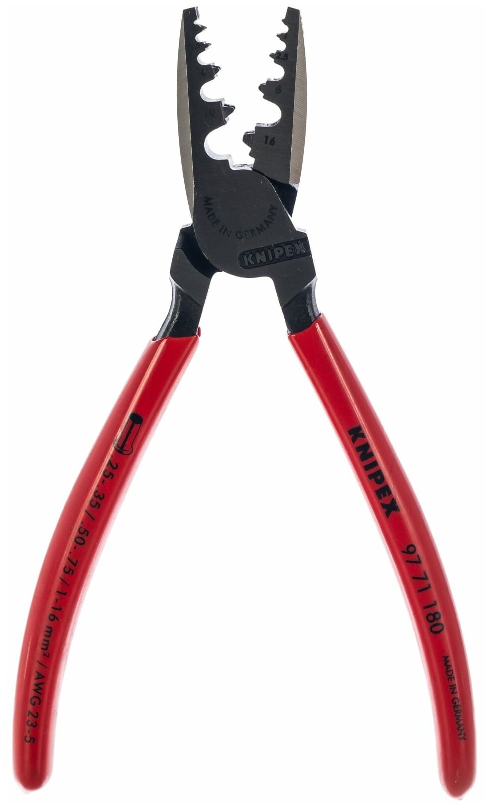 Инструмент для обжима контактных гильз (по стандарту DIN 46 228 часть 1 + 4) в диапазоне сечений от 0,25 до 16 кв.мм. 9 глубоких профилей с коническими гранями. Специальная инструментальная сталь, кованая, закалённая в масле.