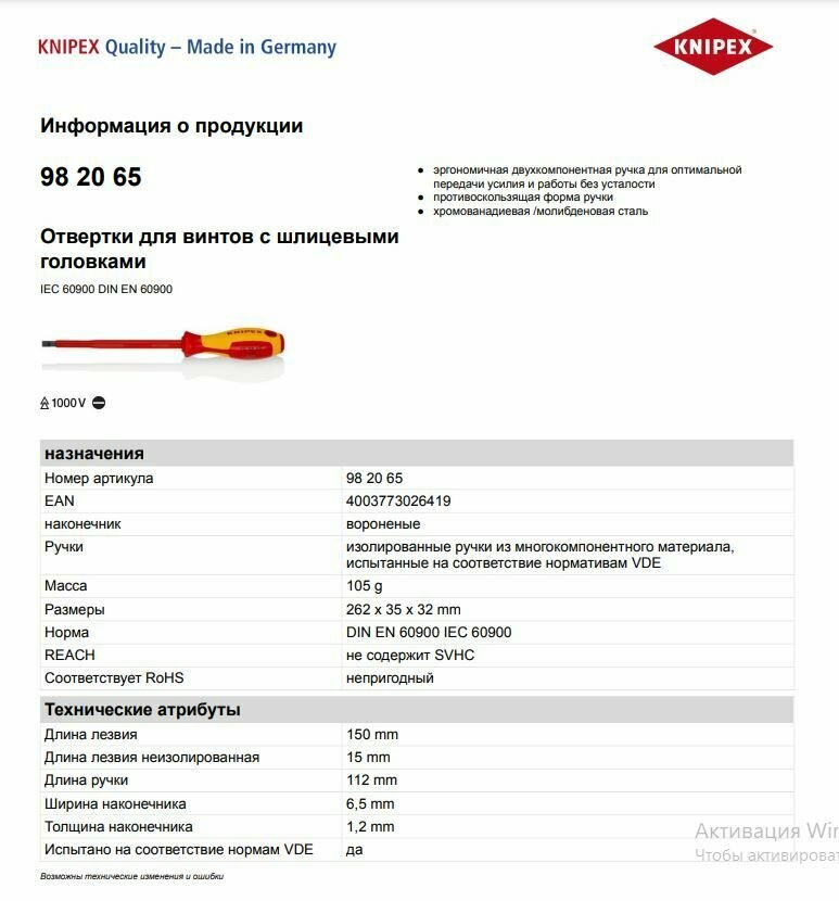 - Обзор Отвертка диэлектрическая KNIPEX KN-982402